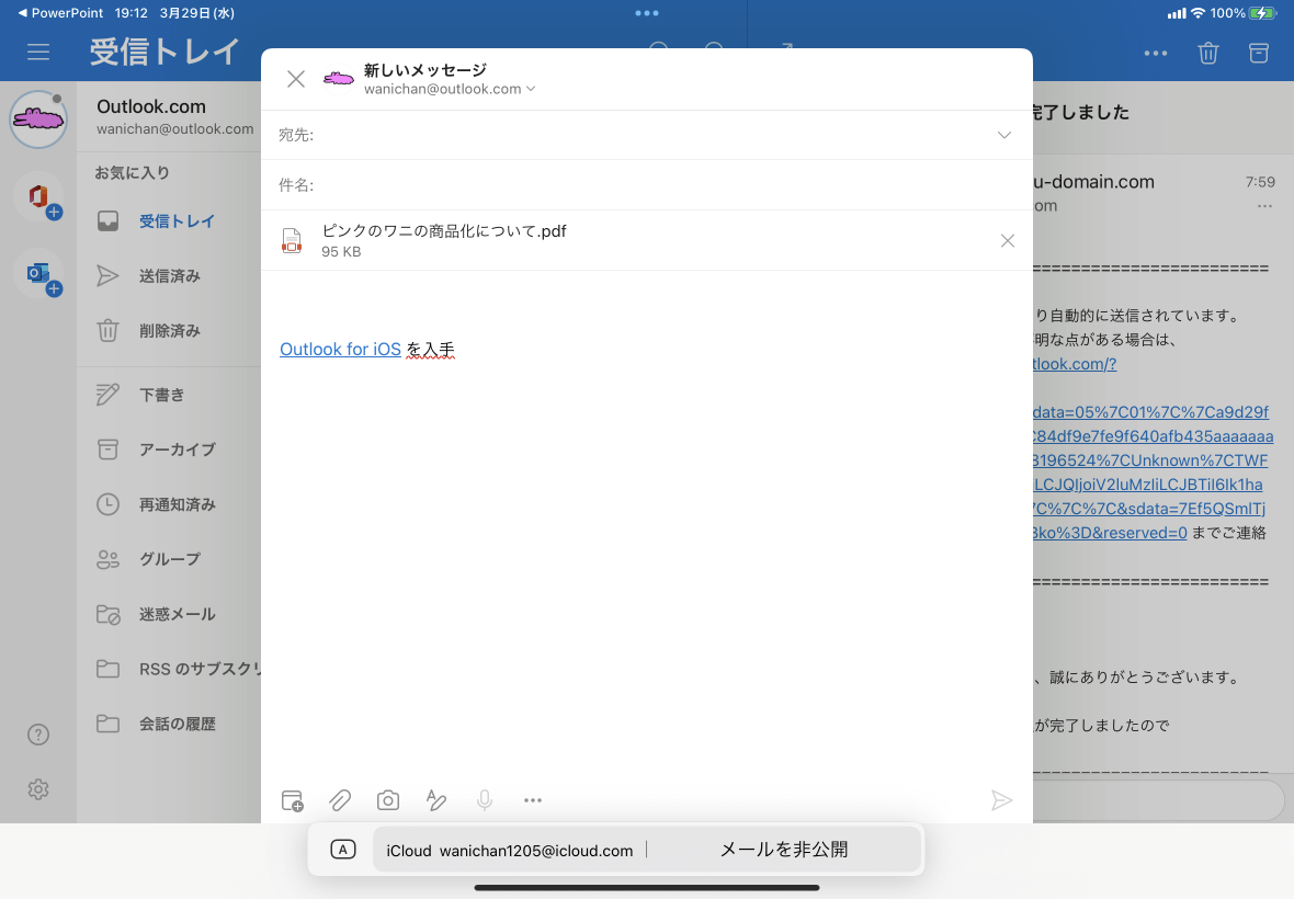 新しいメッセージにPDF形式で添付されたことを確認し、宛先や件名等を編集して、右下の