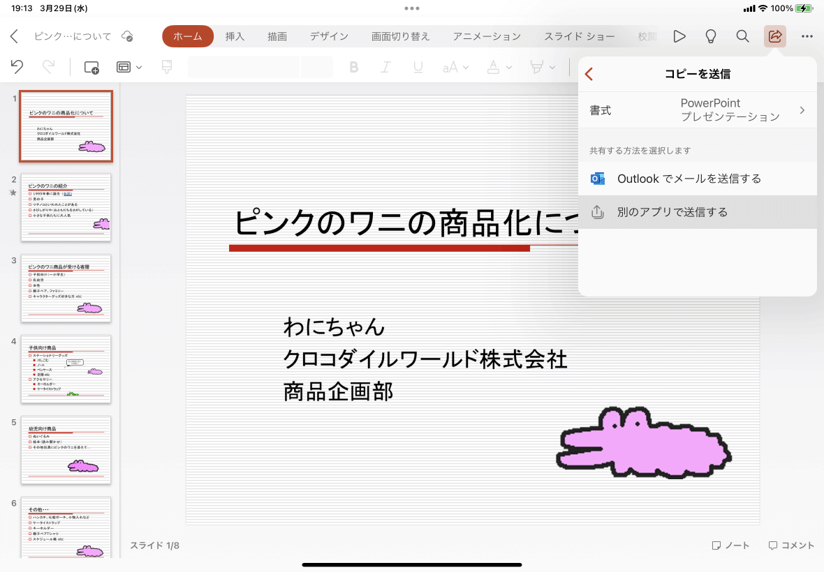 [共有]をタップし、[コピーの送信]から[別のアプリで送信する]を選択して、送信するアプリとして[メール]を選択します。新しいメールのメッセージにそのプレゼンテーションのコピーが添付されます。
