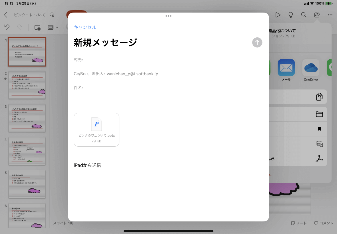 新しいメッセージに作業中のプレゼンテーションのコピーが添付されたことを確認し、宛先や件名等を編集して、右上の[送信]をタップするとOKです。
