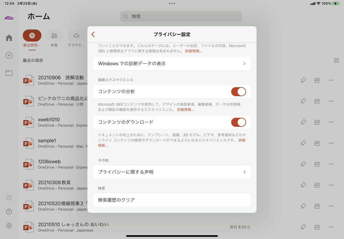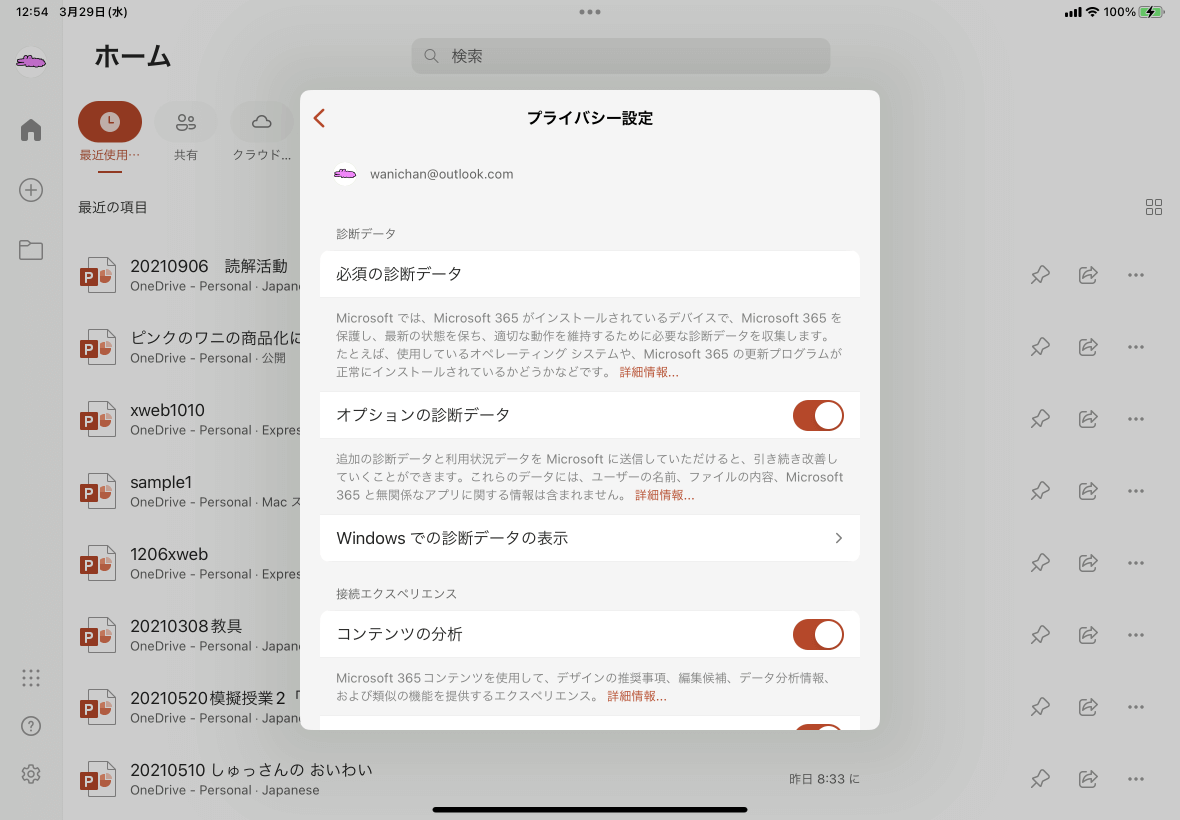 - [プライバシー設定]の[診断データ]オプションでは、「必須の診断データ」と「オプションの診断データ」がオンになっています。オプションの診断データは、ユーザーが提供の可否を選択可能なデータです。このデータは、製品の改善に役立ち、問題の診断と修正に役立つ拡張情報です。たとえば、PowerPointのスライドの縮小版が表示されるまでにかかる時間を提供することで、その機能のパフォーマンスを向上させることができます。診断データの収集をしないようにするには、該当オプションのスイッチをオフにします。