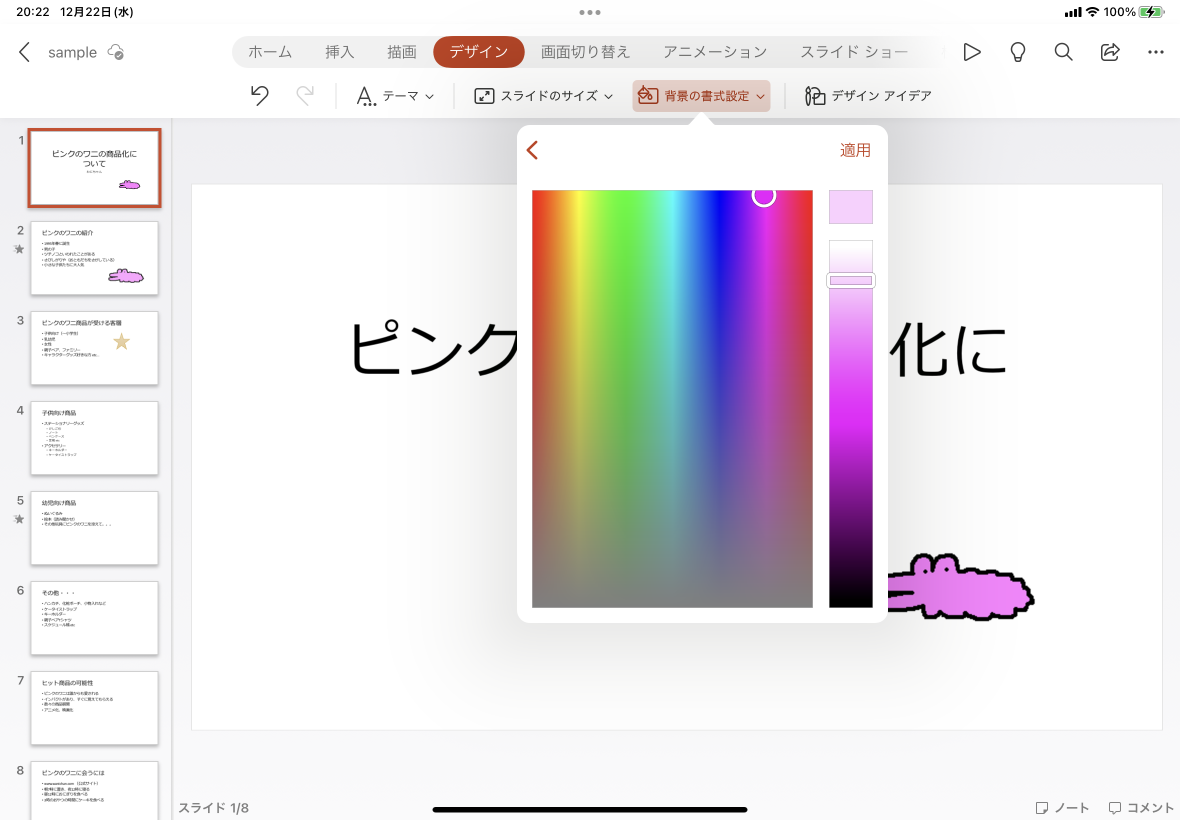 PowerPoint for iPadでスライドの背景色を変更するには、[デザイン]タブを開き、[背景の書式設定]一覧より選択します。一覧にない場合は、色を作成することも可能です。