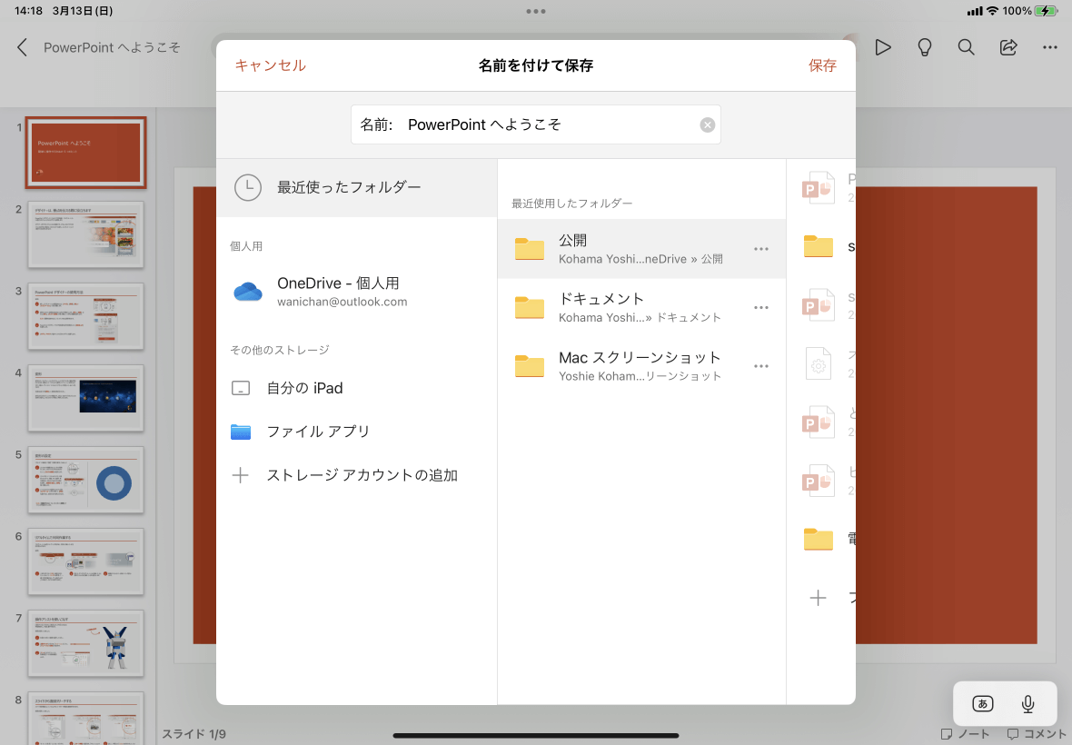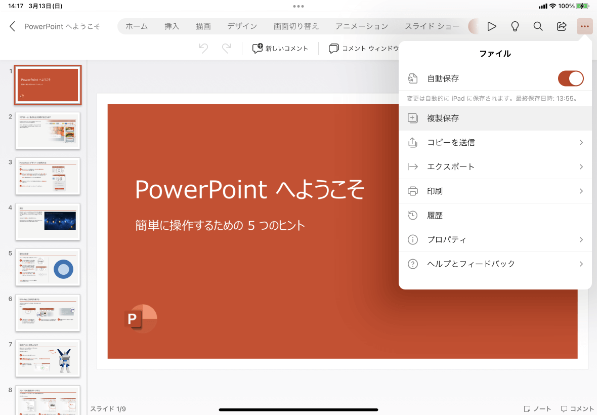 現在作業中のプレゼンテーションがすでに保存されている場合、そのプレゼンテーションを複製することができます。[ファイル]をタップして[複製保存]をタップし、[名前を付けて保存]画面でファイル名と保存場所を指定します。ここでは、OneDriveの[公開]フォルダーに保存する方法について説明します。