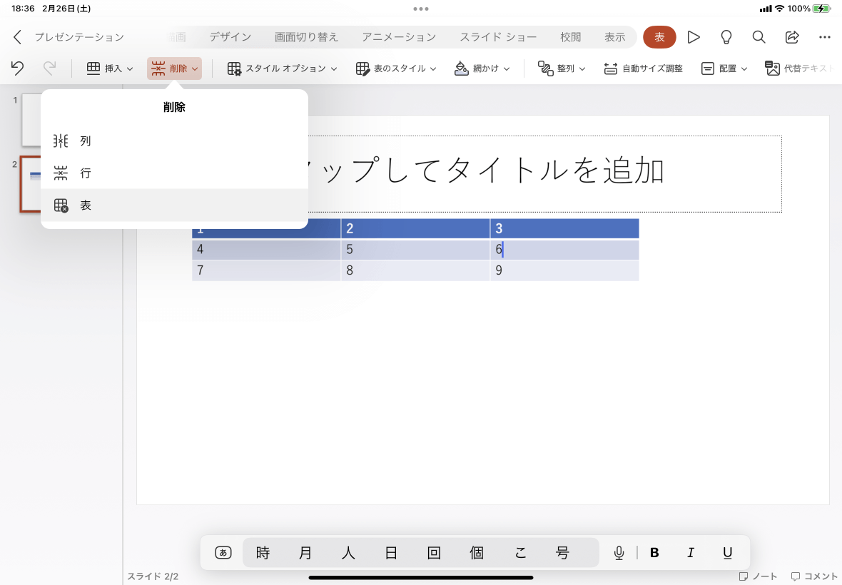 - 表内の対象となるセル内にカーソルを移動し、[表]タブを開き、[削除]をタップします。