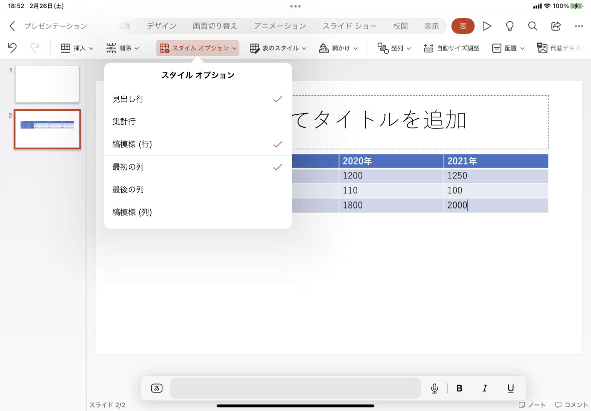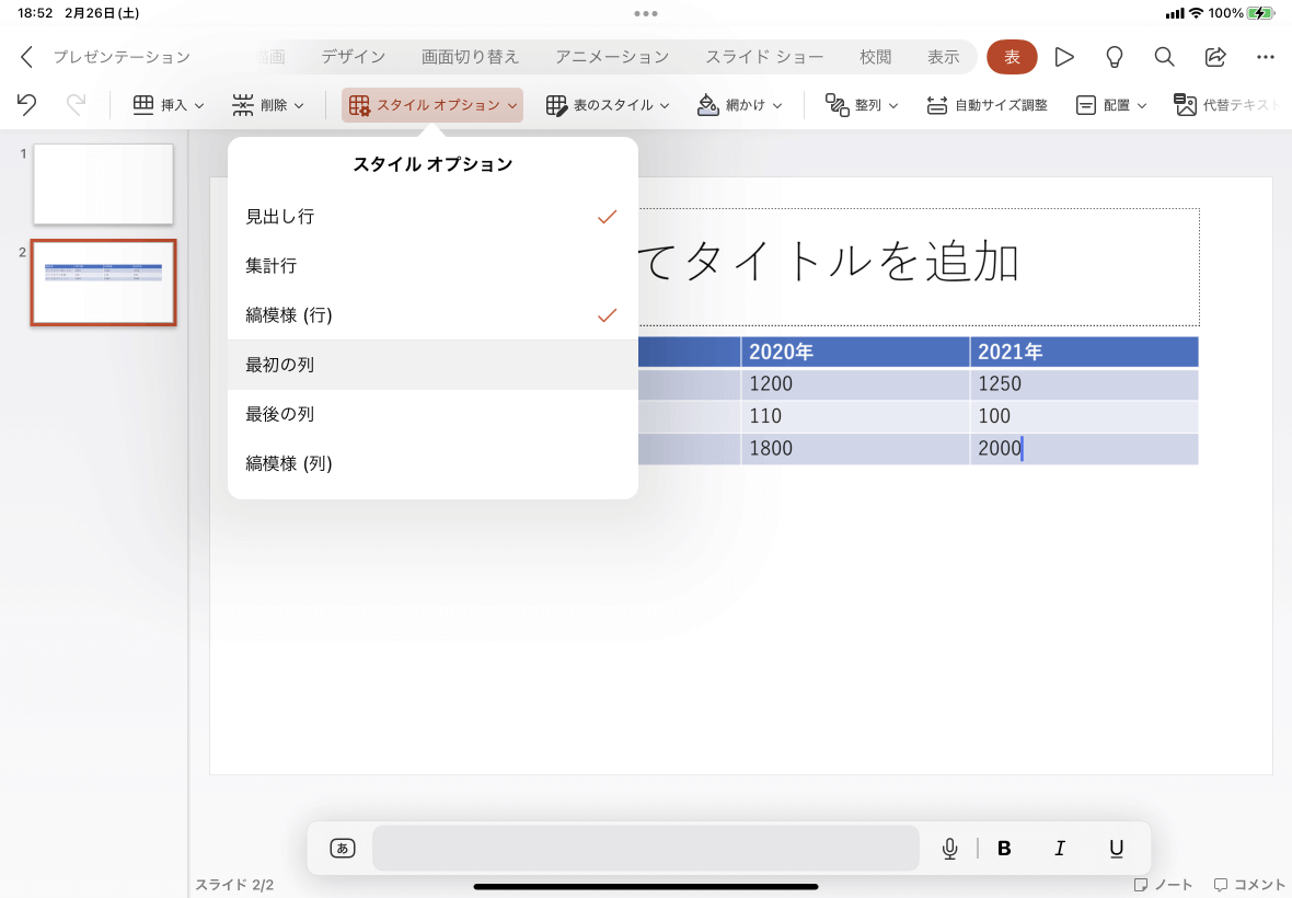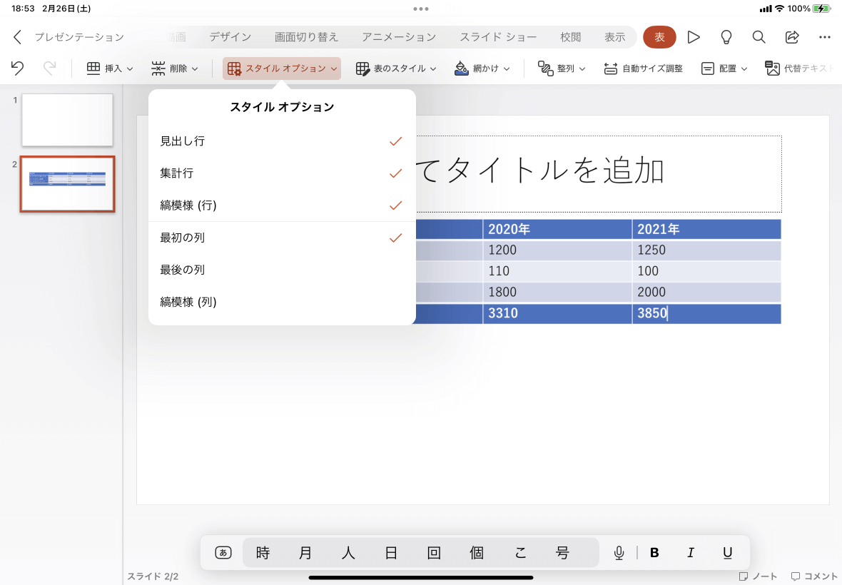 PowerPoint for iPad既定の設定では最初の行が見出しとして設定され、1行ごとにコントラストの異なる縞模様が適用されています。最初の列を見出しにしたい、最後の行を集計行としたい場合など、表スタイルのオプションを設定するには、[表]タブ内の[スタイルオプション]をタップして、目的のスタイルオプションにチェックを付けます。