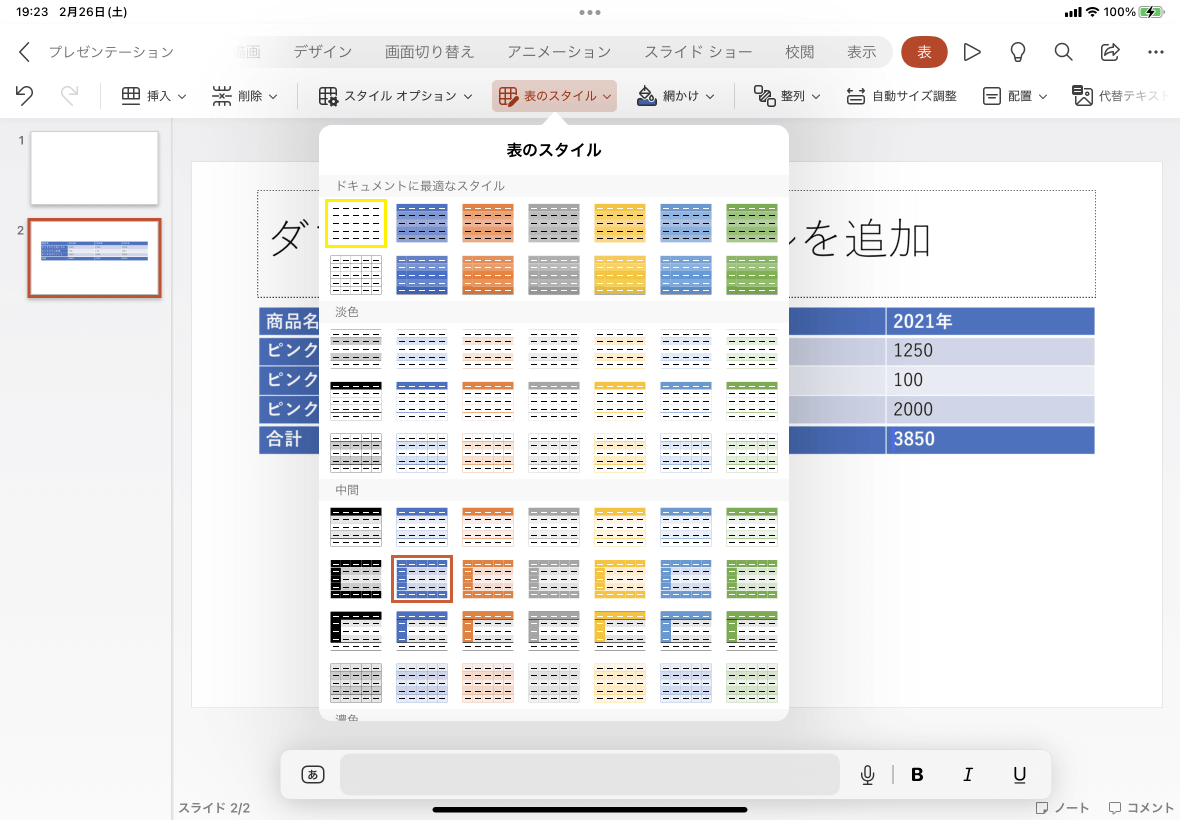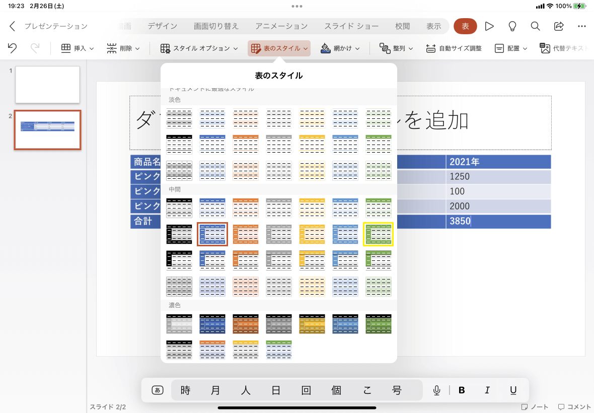 - 表内にカーソルを移動して[表]タブの[表のスタイル]をタップします。