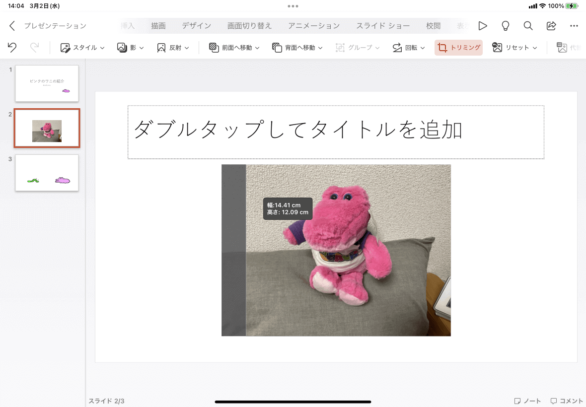 PowerPoint for iPadでトリミングしたい図を選択して[画像]タブを開き、[トリミング]をタップして、ハンドルを使って図をトリミングします。