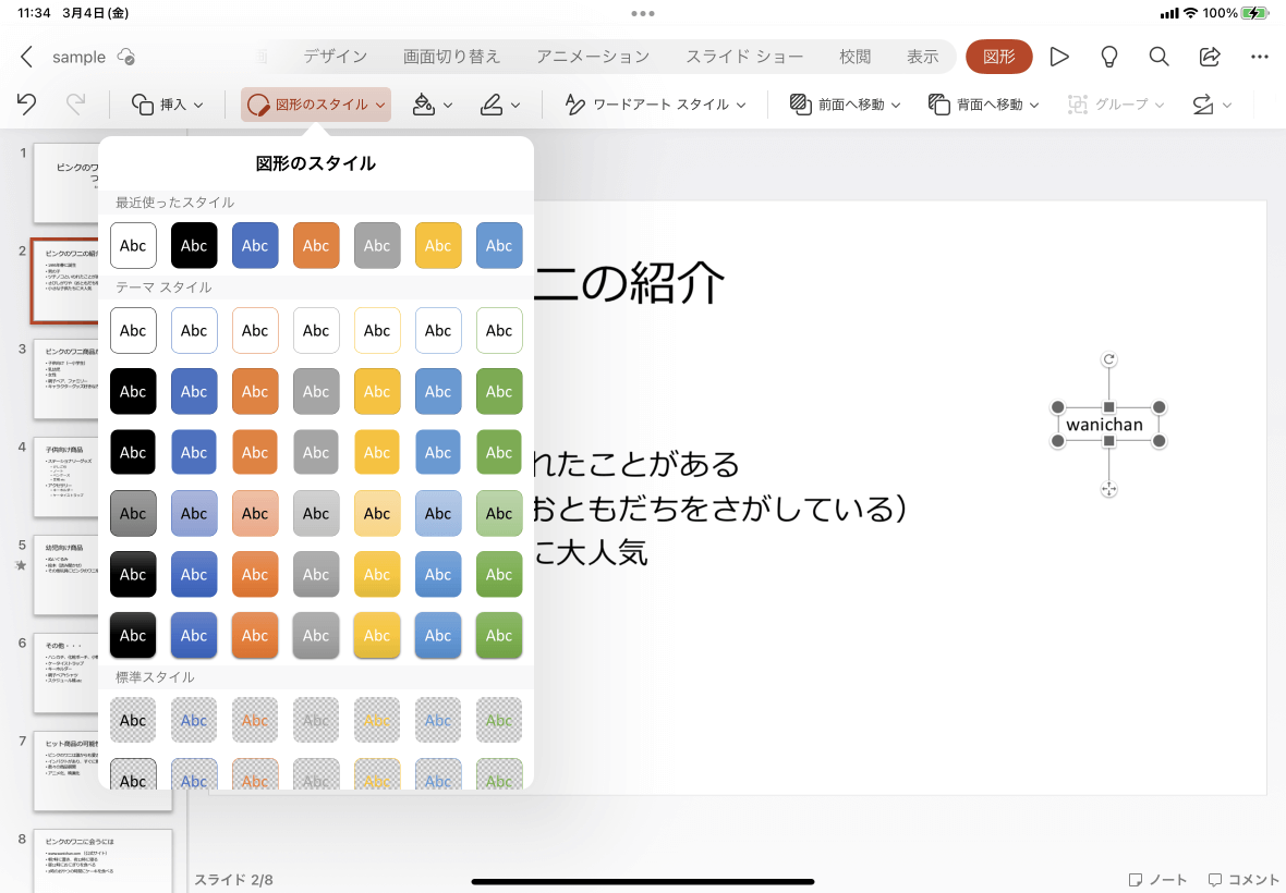 - テキストボックスを選択して[図形]タブを開き、[図形のスタイル]コマンドをタップします。