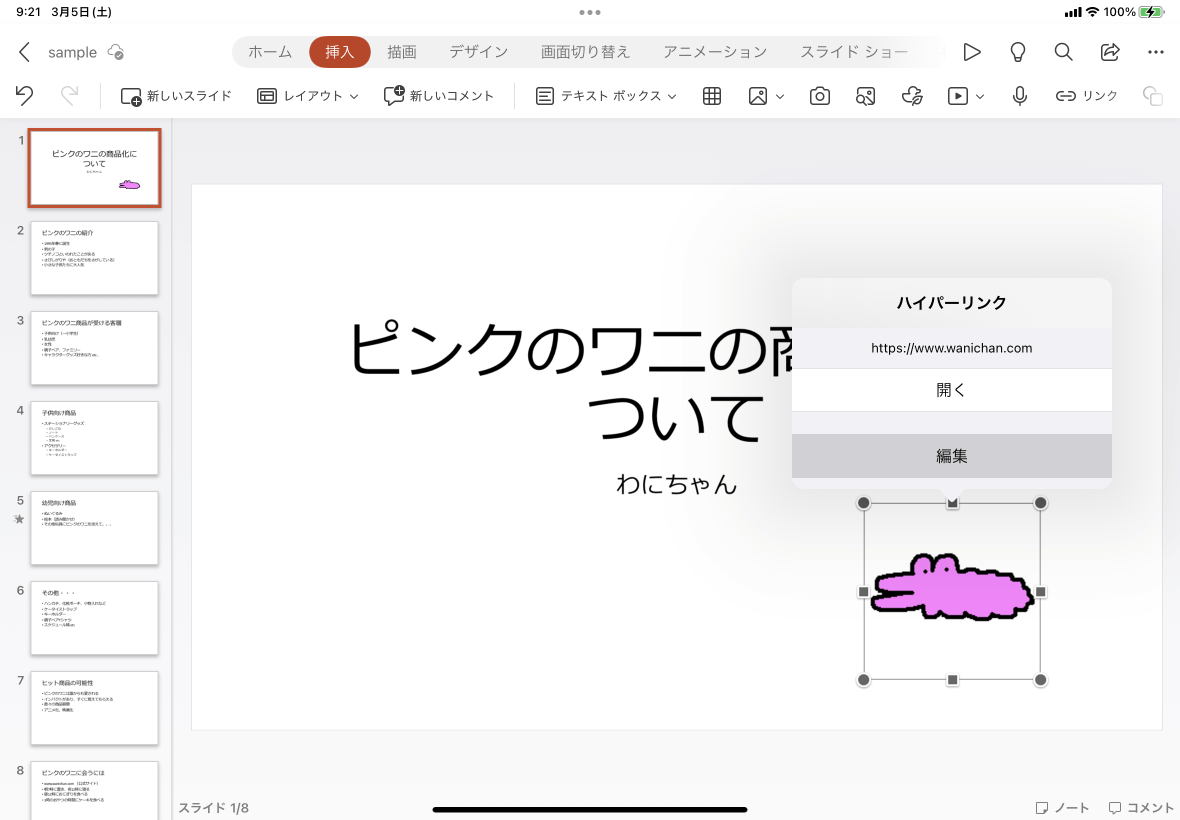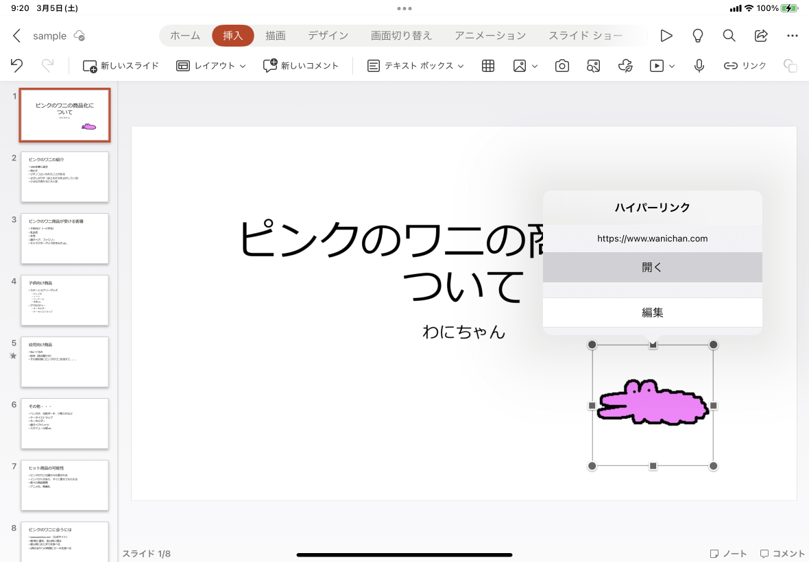 - リンクが張られたオブジェクトを選択して[挿入]タブの[リンク]をタップするか、ポップアップメニューから▶をタップして[リンク]をタップします。