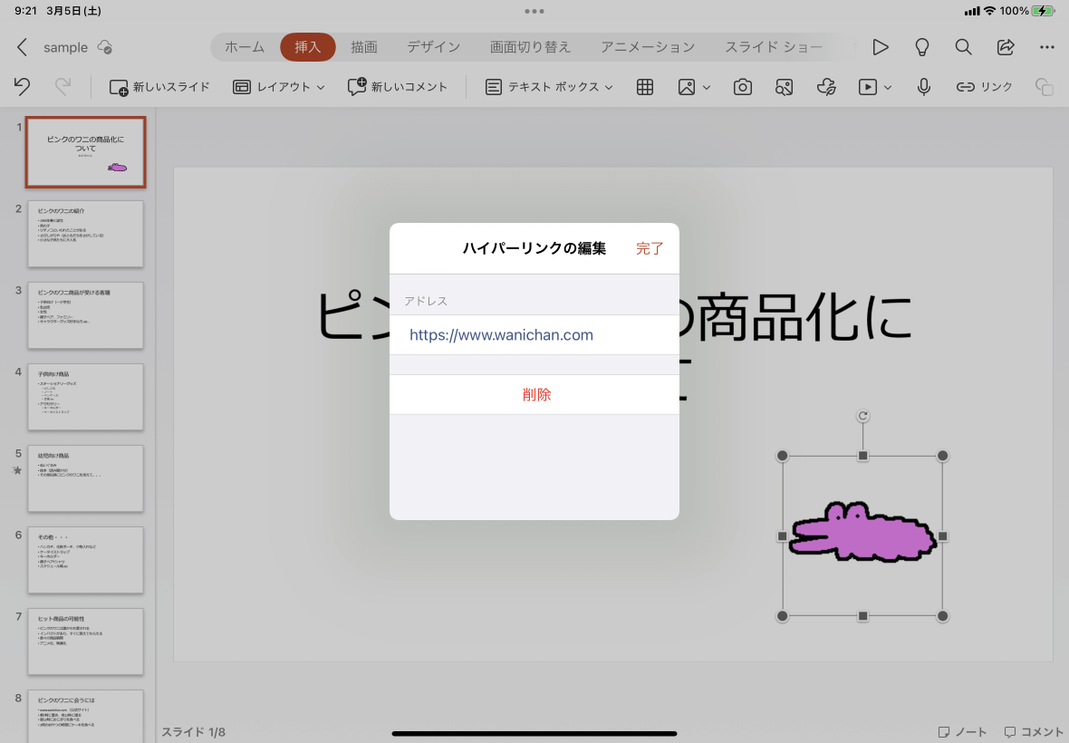 インターネットのサイトにリンクするには、対象となるオブジェクトを選択し、[挿入]タブを開いて[リンク]をタップし、インターネットアドレスを入力します。すると、スライドショー再生中にそのオブジェクトをタップすると、リンク先のアドレスがSafariで開きます。
