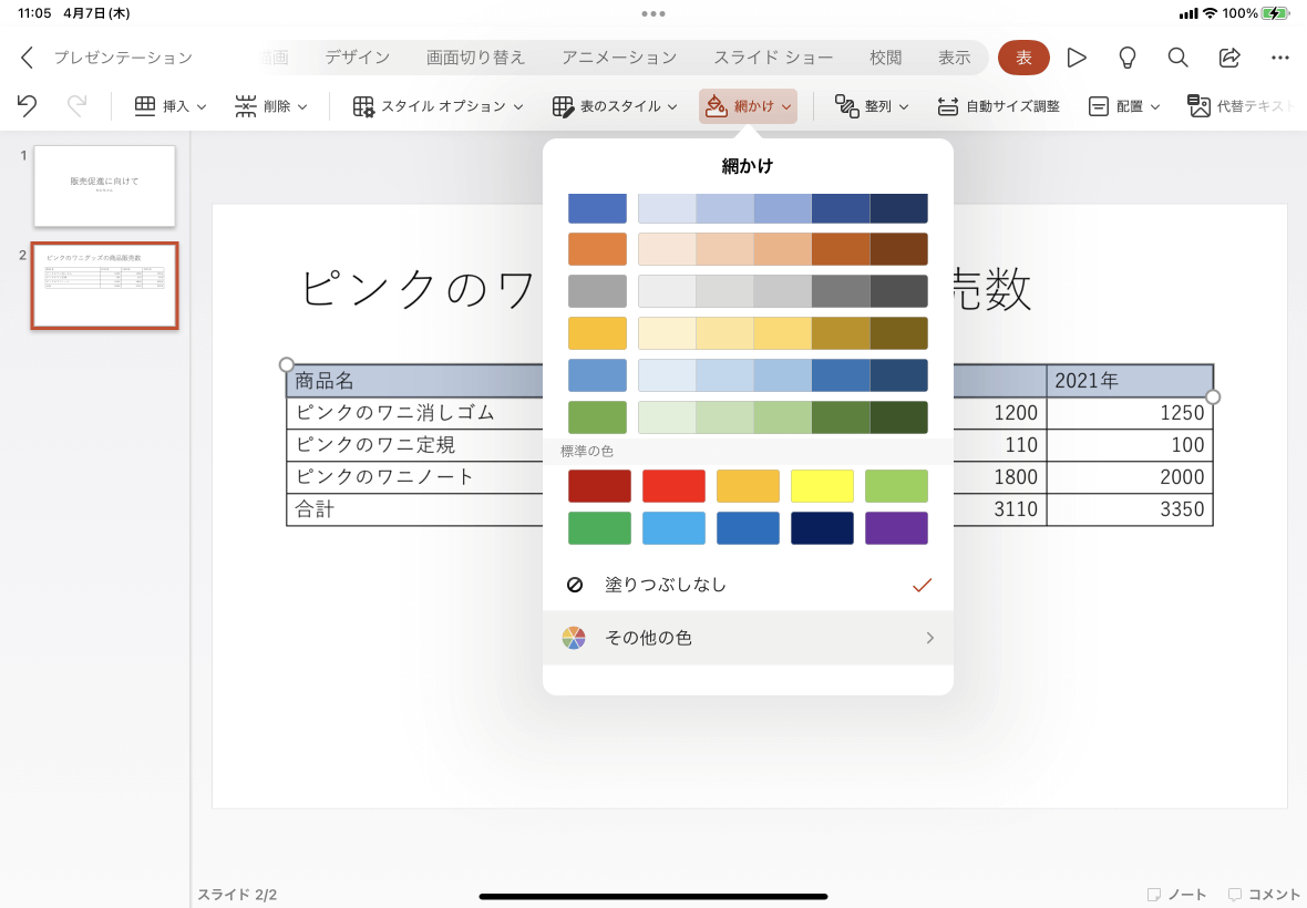 スライド上の表全体の組み込みスタイルに希望の配色がない場合は、背景色を別指定することも可能です。対象となる表内のセルを選択し、[表]タブの[網かけ]一覧から背景色を選択します。[塗りつぶしなし]にすると背景色がクリアになります。