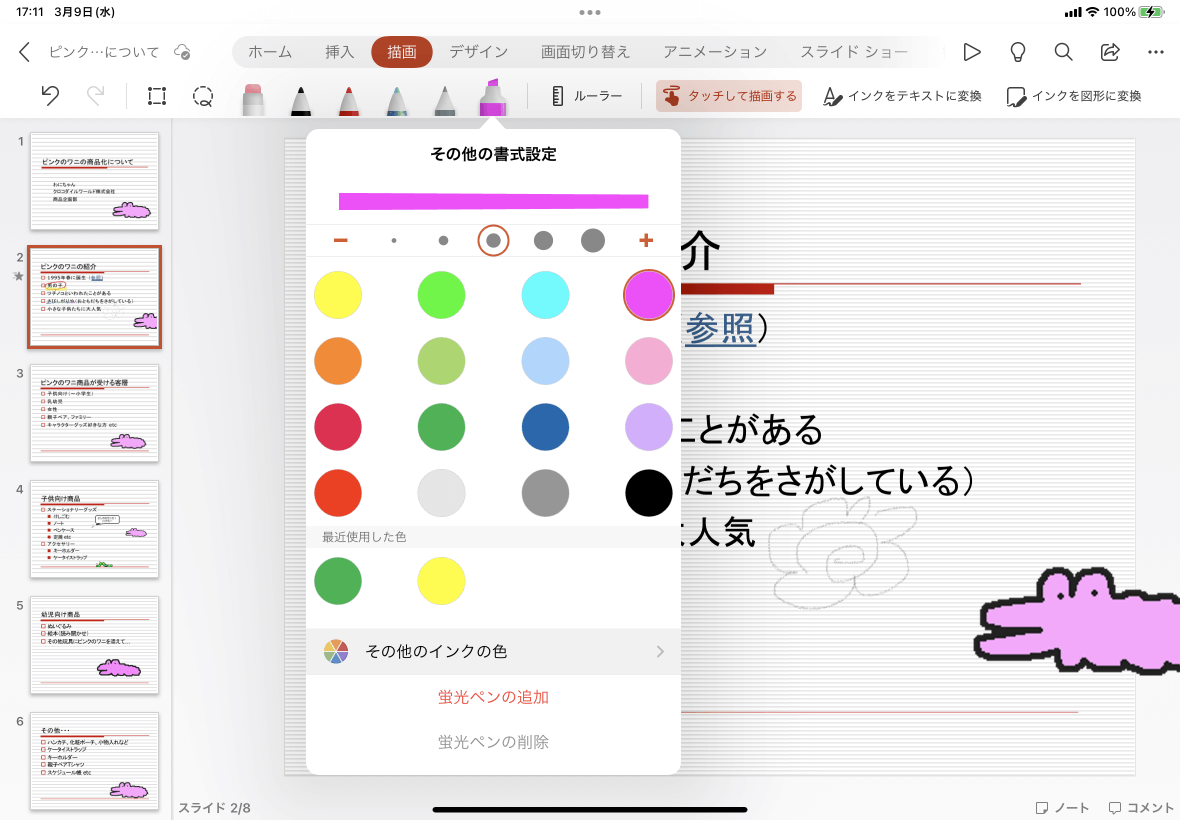 - [描画]タブを開き、変更したいペンを2回タップして、[その他の書式設定]ポップアップ一覧から[その他のインクの色]を選択します。