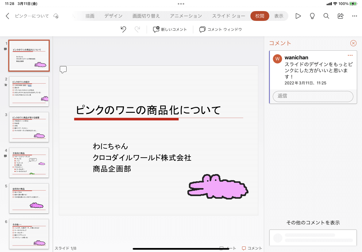 PowerPoint for iPadでコメントが付いたプレゼンテーションを開き、[校閲]タブの[コメントウィンドウ]をタップします。なお、コメントが付けられたスライドを開き、左上のコメントのアイコンをタップしてもコメントの内容を確認できます。