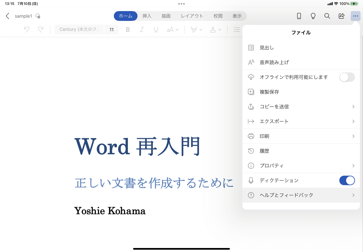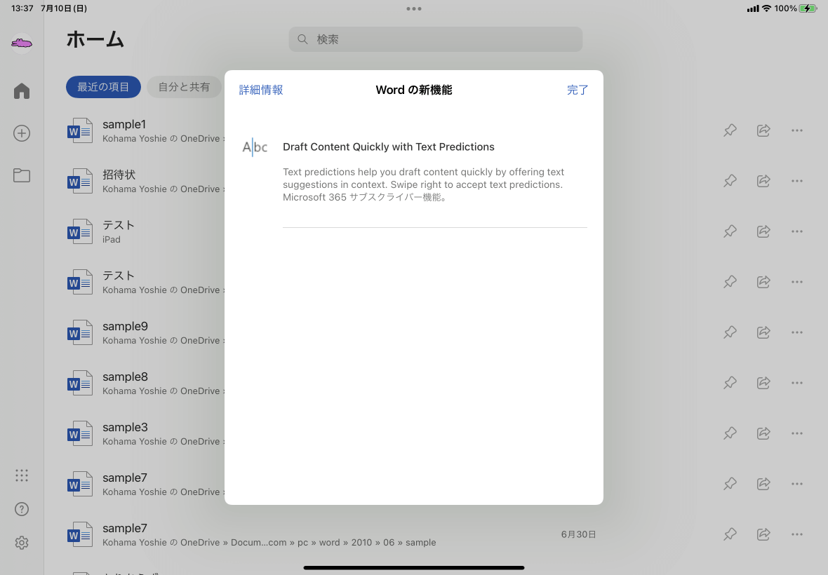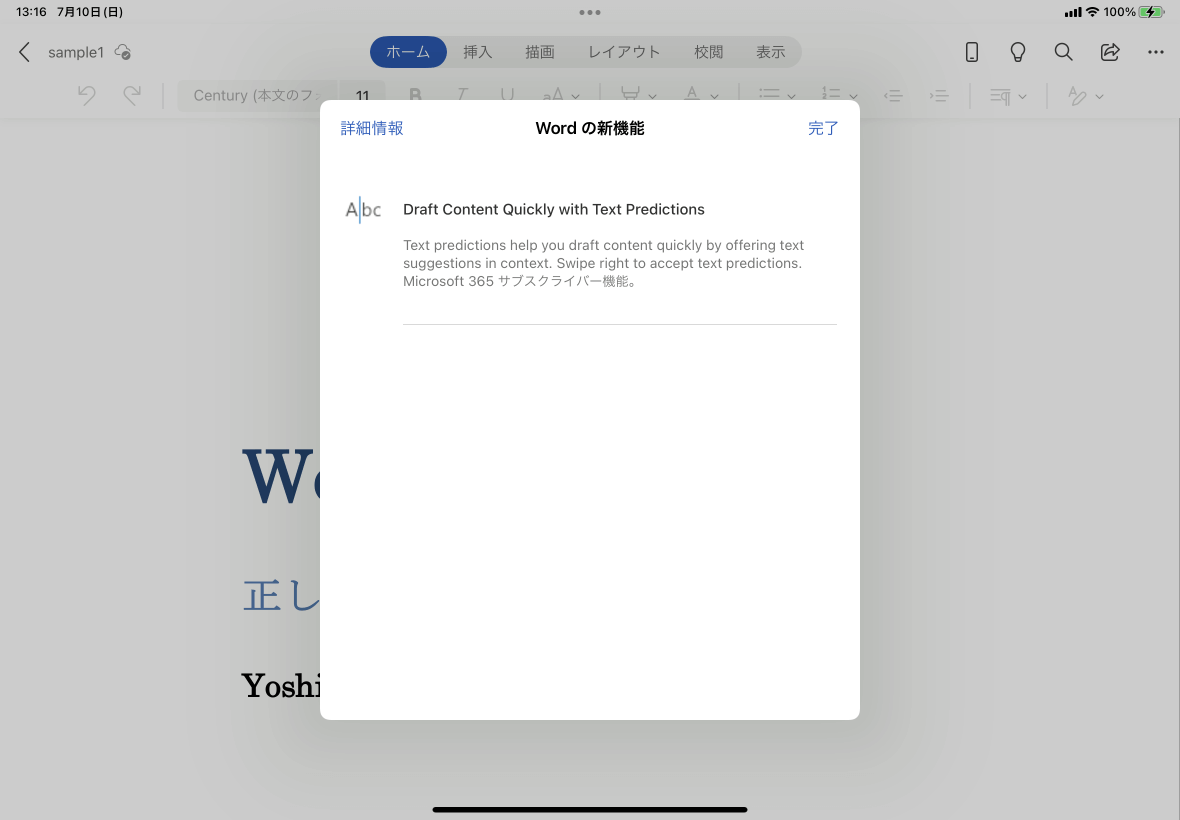 iPadにWordアプリをインストールしてから追加された機能を確認するには、画面の右上の