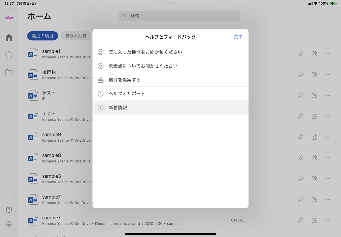 Word for iPadの新着情報の確認