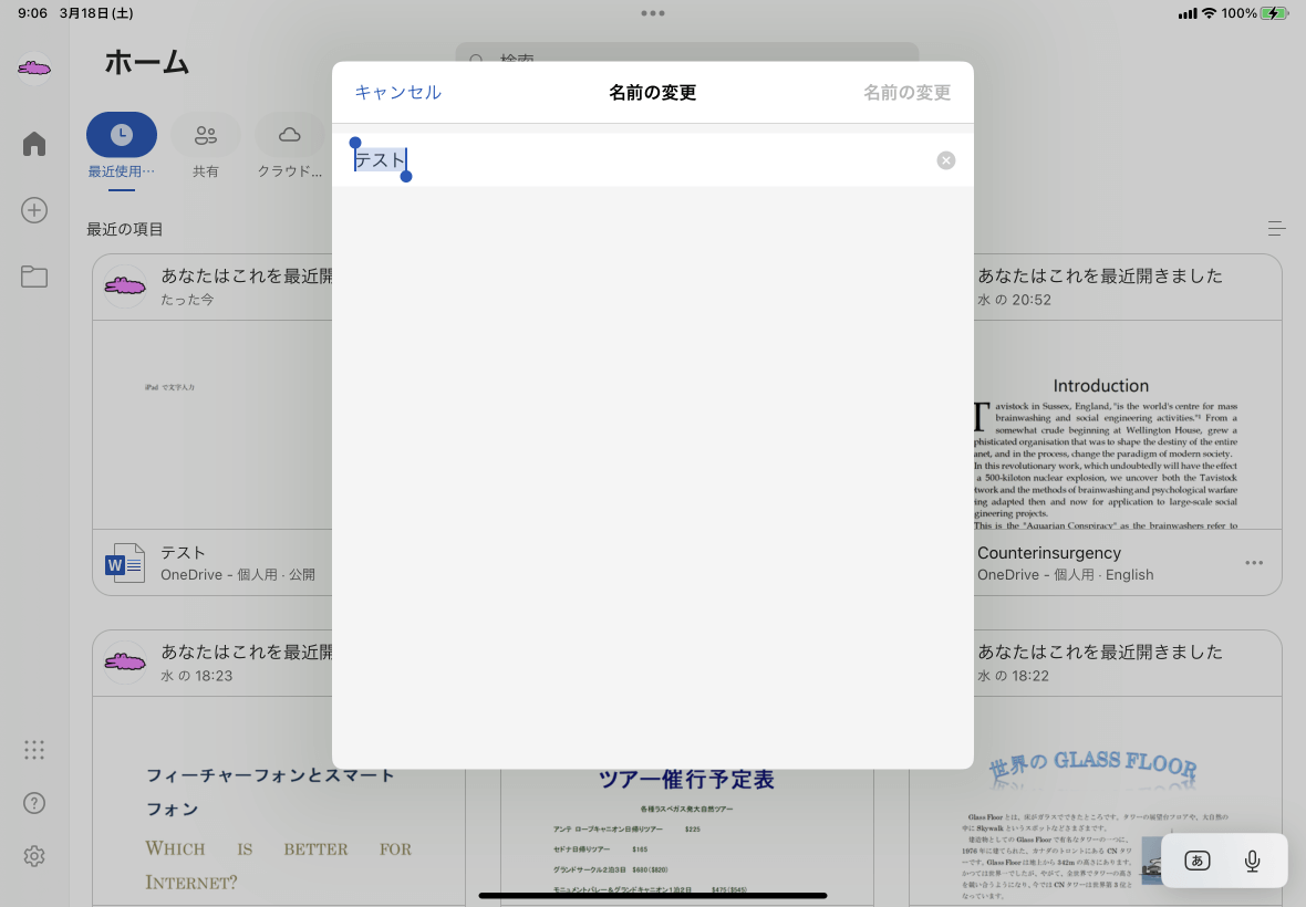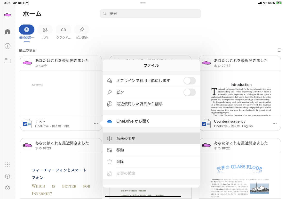 Word for iPadからでもOneDrive上のファイル名を変更できます。対象となるファイルの項目の右側の