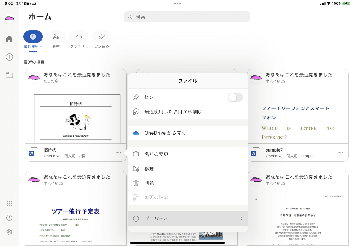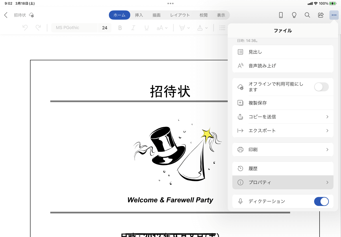 [ファイル]をタップし、[プロパティ]を選択します。作業中の文書の場合は