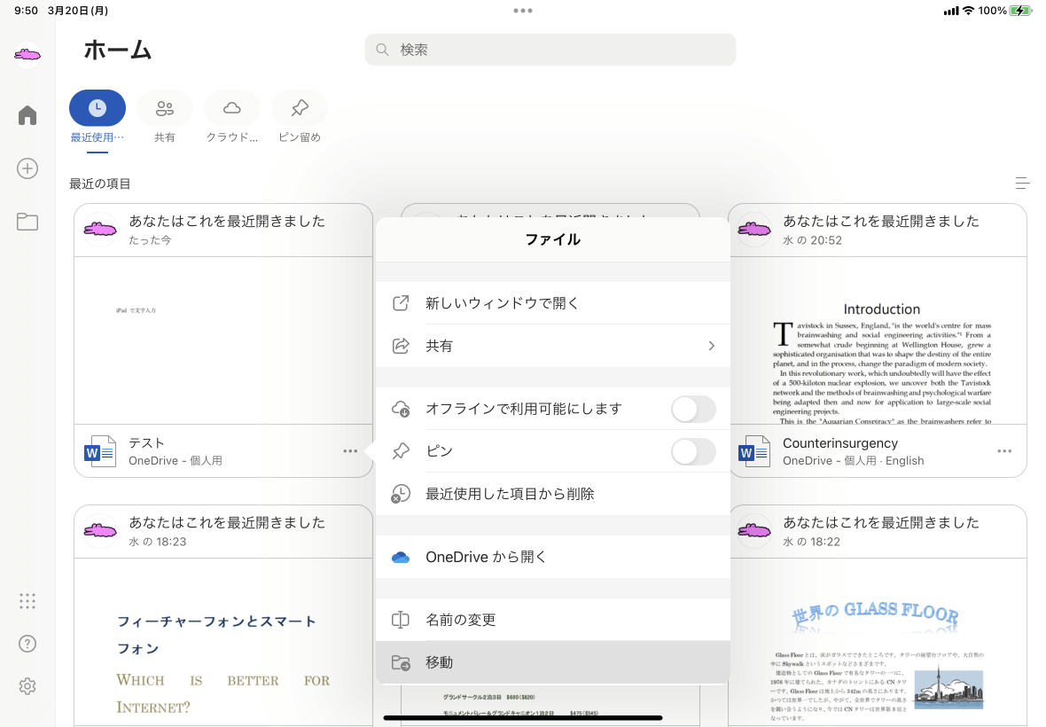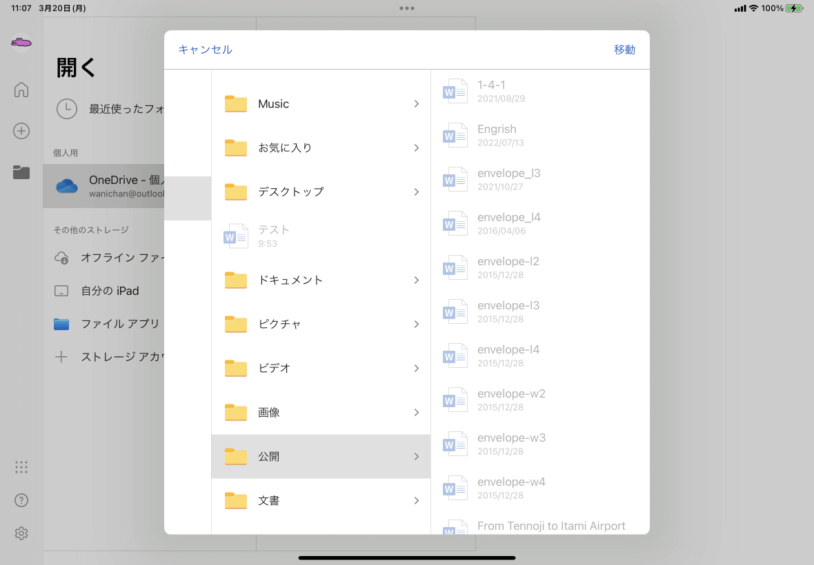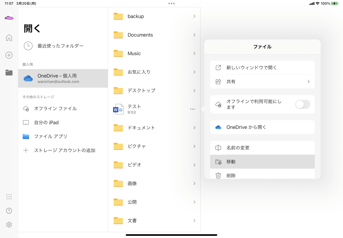 [ファイル]をタップし、[移動]を選択して、移動先の場所を選択します。ただし、自分のiPadに保存されている場合は[移動]コマンドがありません。クラウドに移動してはじめて可能になります。