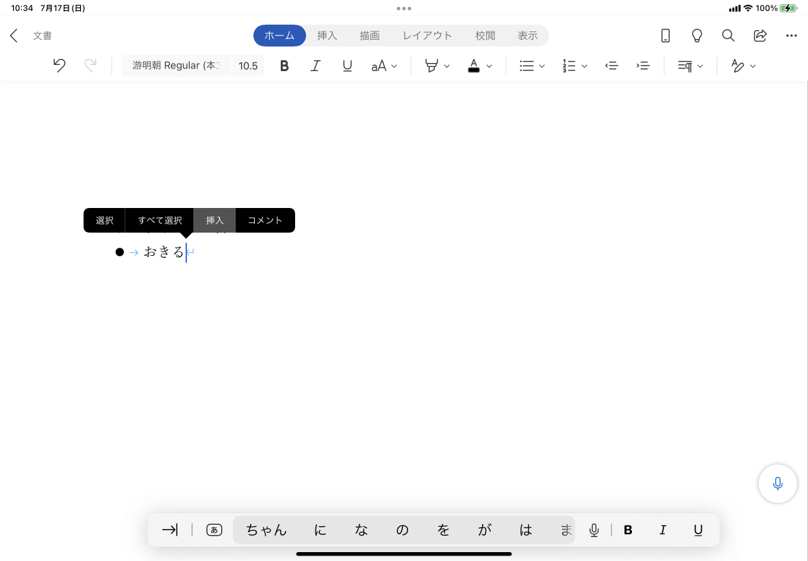 - 改行したい場所にカーソルを移動して2回タップし、ポップアップメニューから[挿入]を選択します。