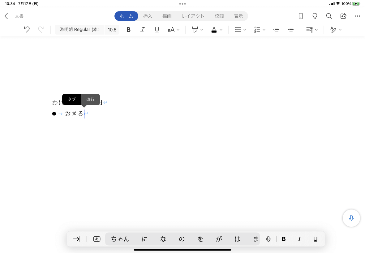 段落を分割せずに、段落内で改行するには、改行したい場所にカーソルを移動して2回タップし、ポップアップメニューから[挿入]を選択して[改行]を選択します。段落内で改行することで、ぶら下げインデントが行えます。