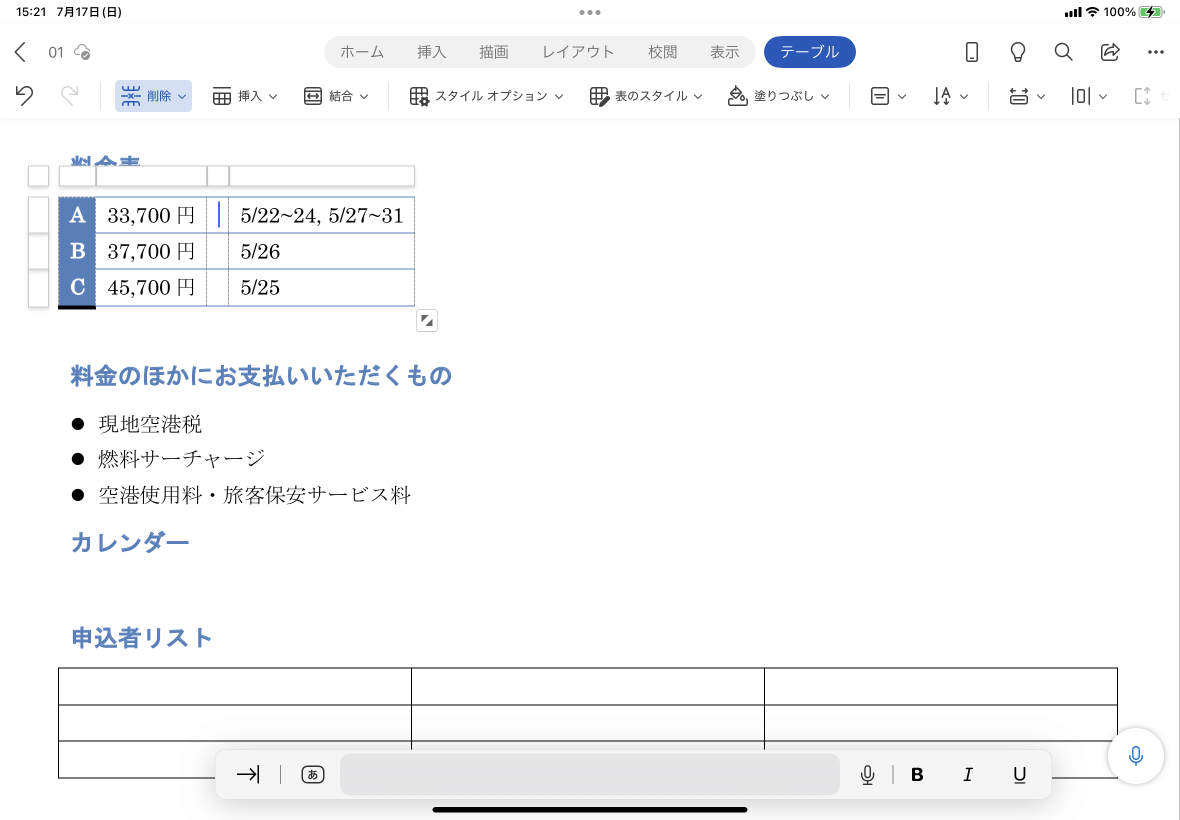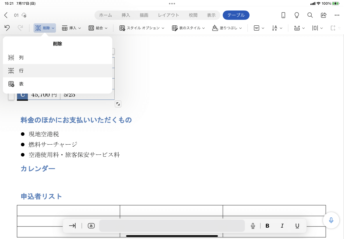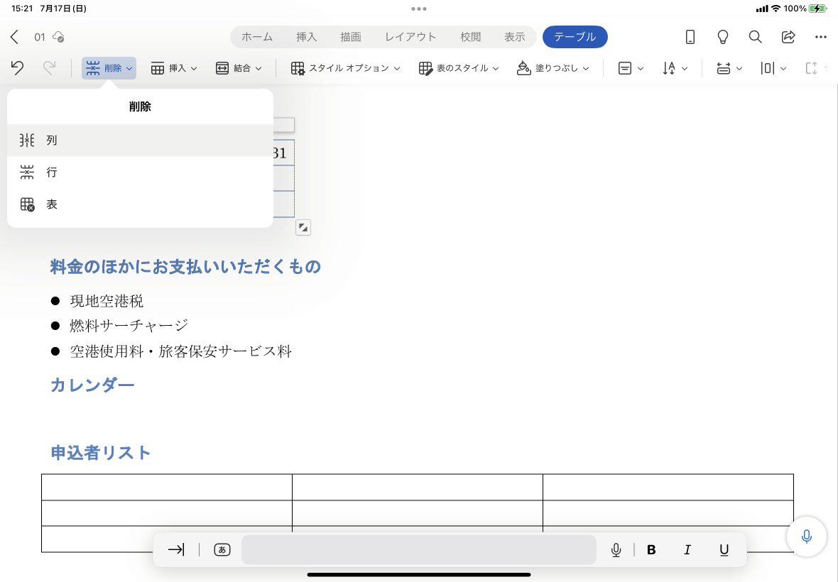 - 表内の対象となるセル内にカーソルを移動し、[テーブル]タブを開き、[削除]をタップします。