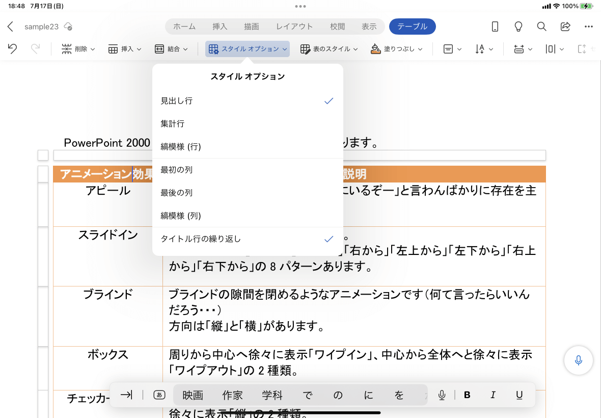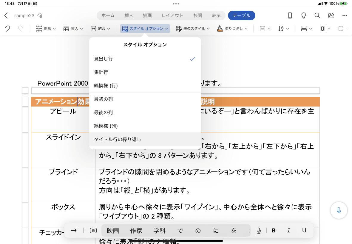 複数ページに表がまたがる場合、Excelと同じように各ページにタイトル行を挿入するには、最初の行内にカーソルを移動し、[テーブル]タブを開いて、[スタイルオプション]から[タイトル行の繰り返し]をタップします。