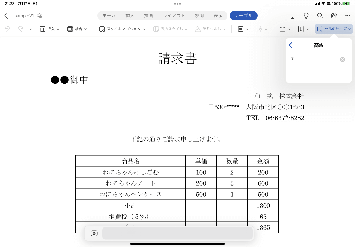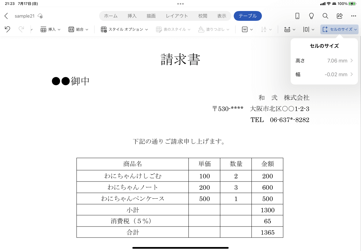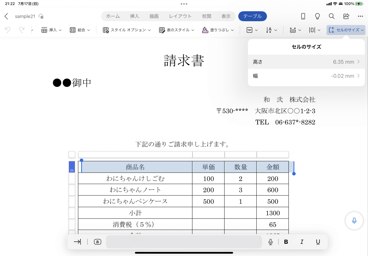 Word for iPadでもセルの幅や高さを数値で指定できます。単位はmmです。対象となるセルを選択して[テーブル]タブを開き、[セルのサイズ]ボタンをタップして、幅や高さの数値を指定します。