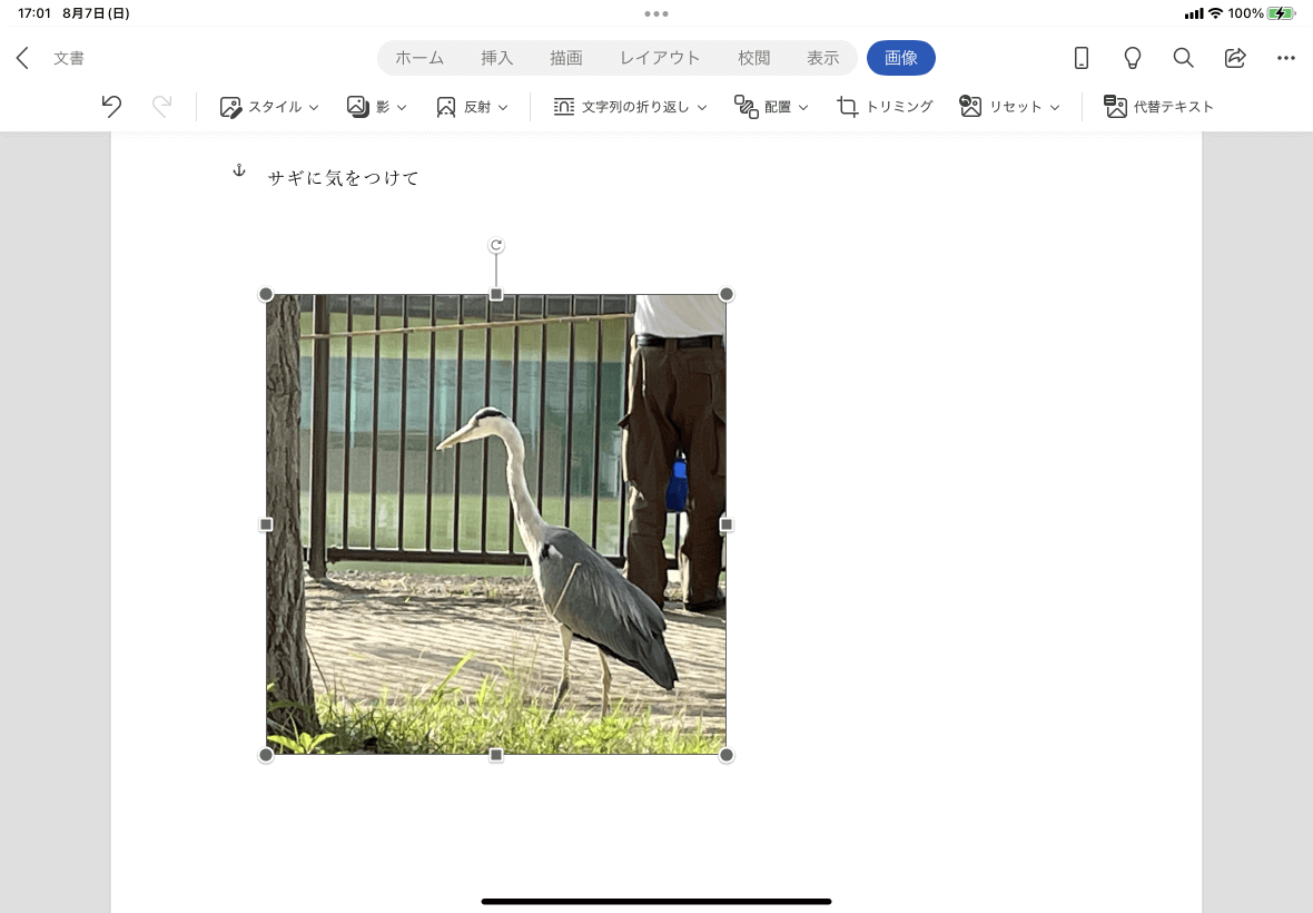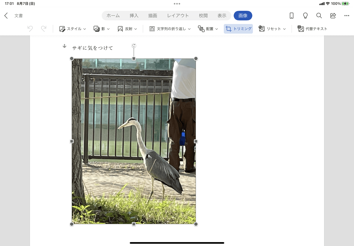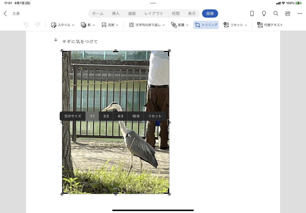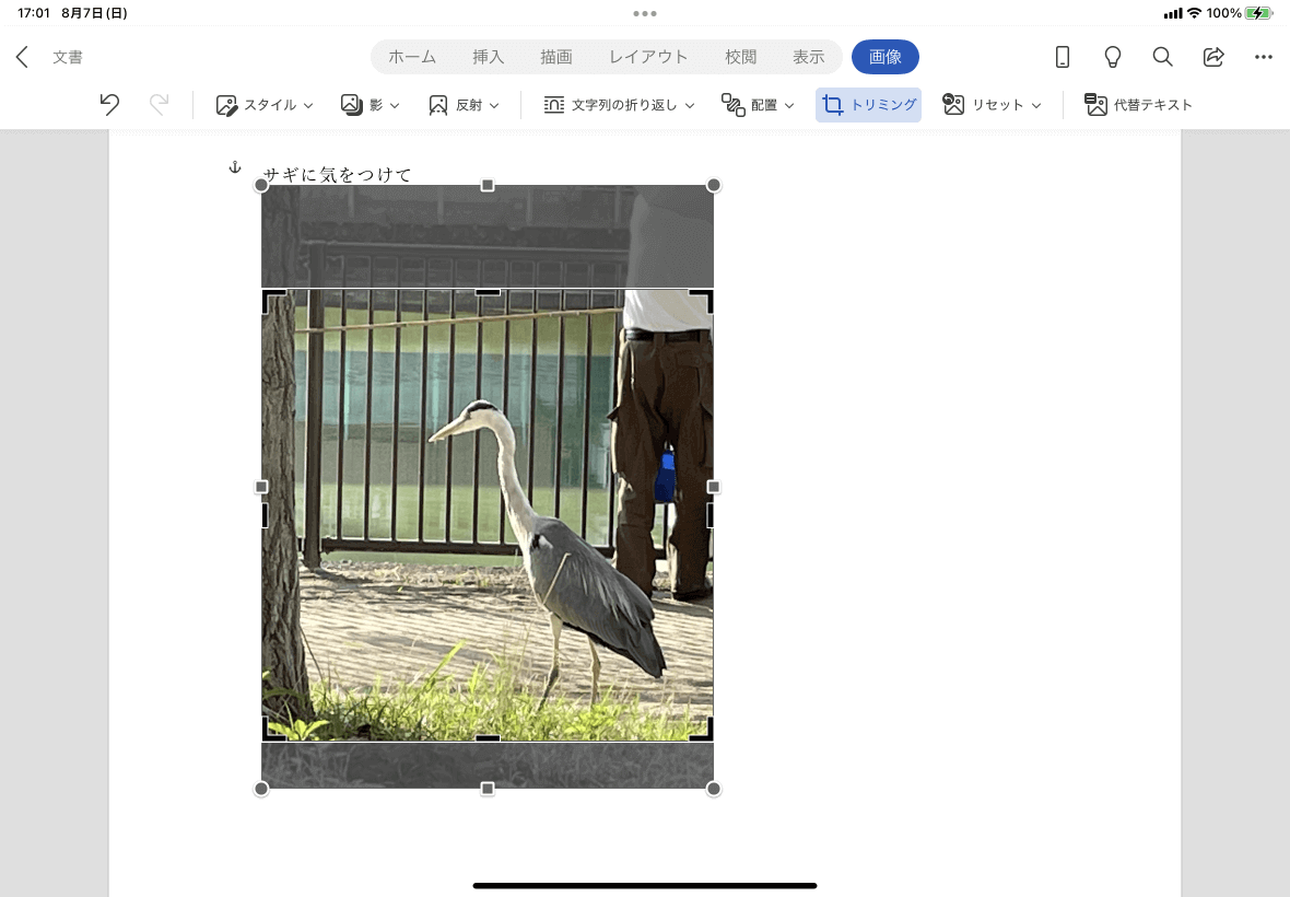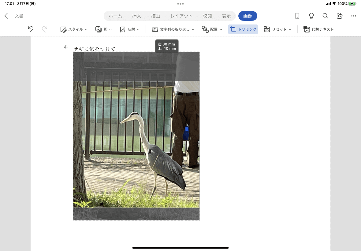 - トリミング対象となる図を選択して[画像]タブを開き、[トリミング]をタップします。