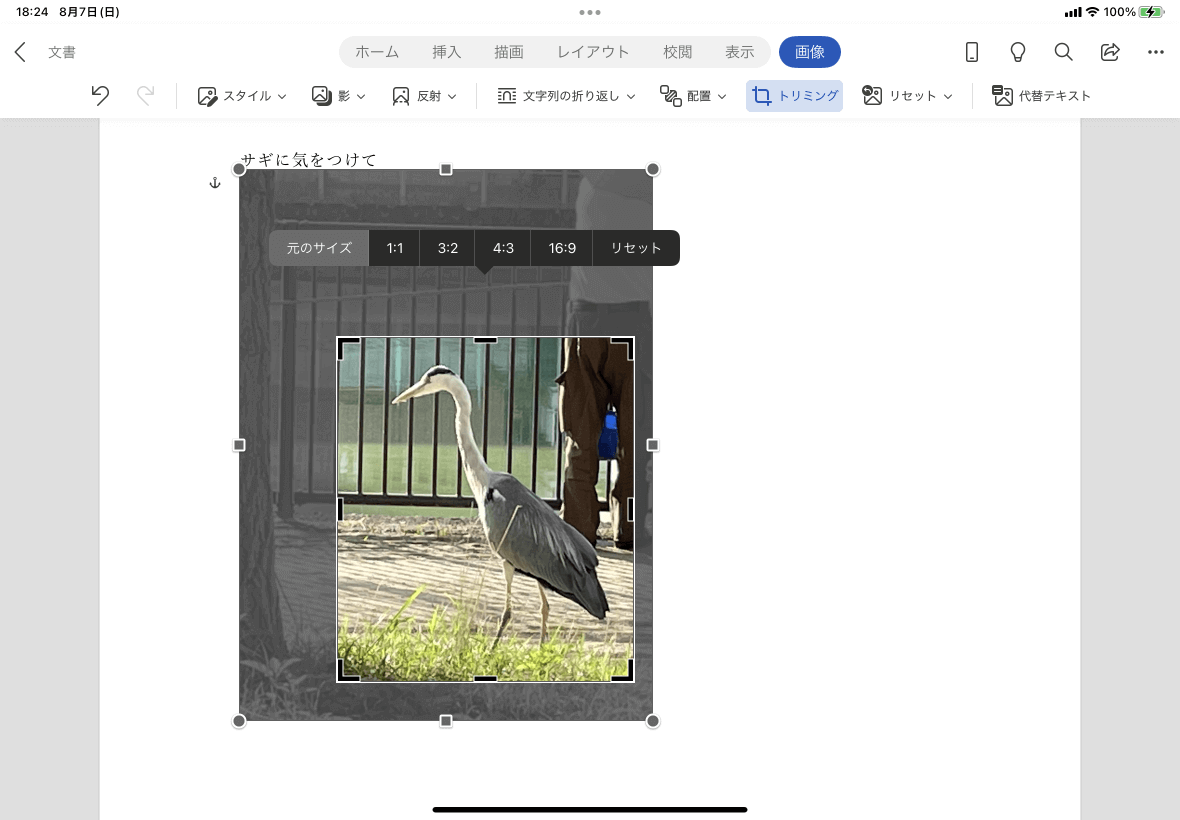 - トリミング対象となる図を選択して[画像]タブを開き、[トリミング]をタップします。