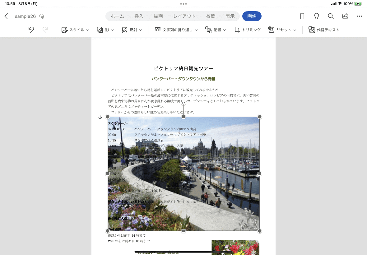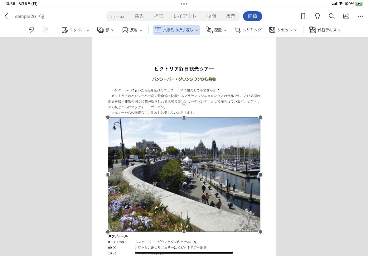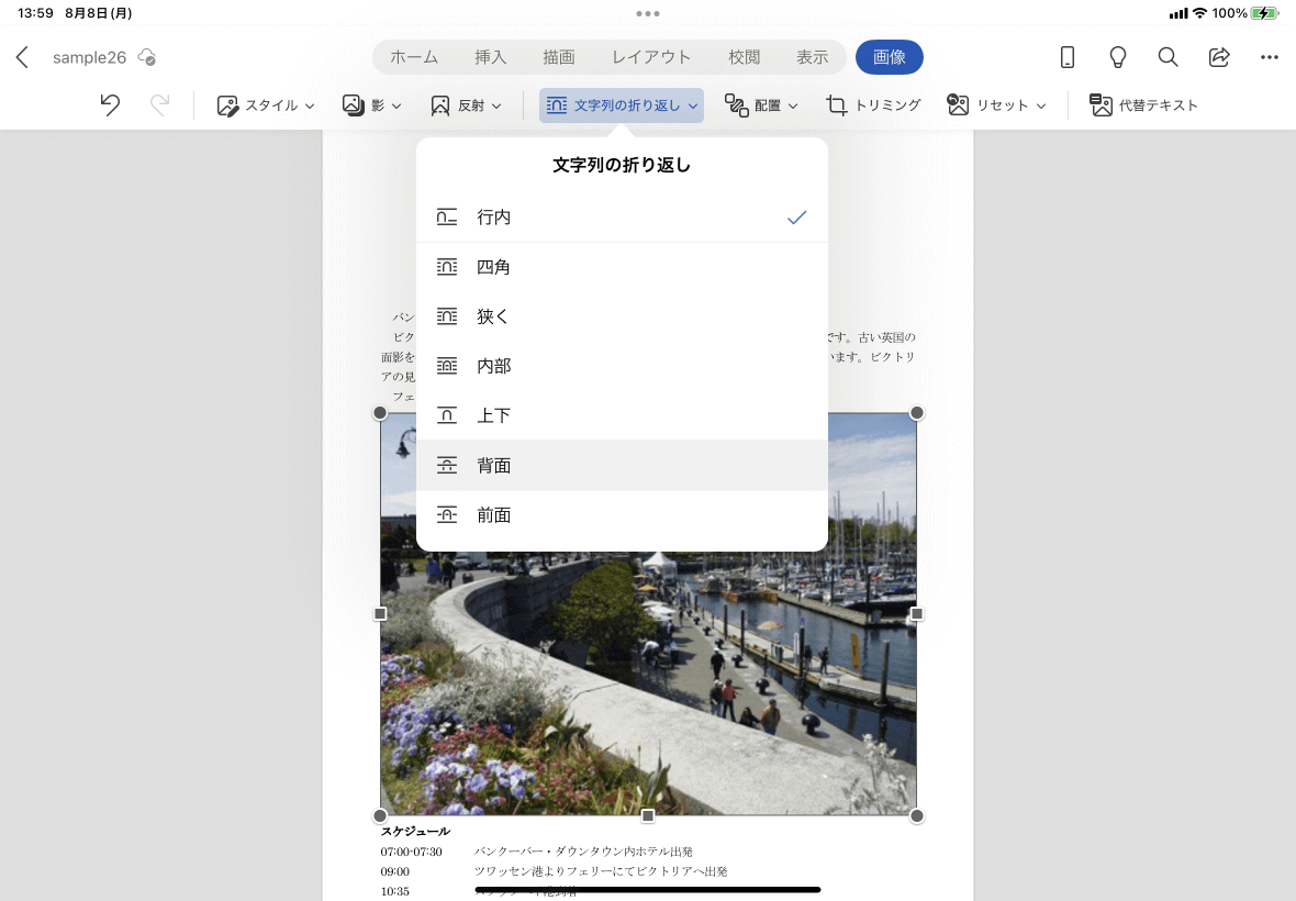 - 図を選択して、[画像]タブを開き、[文字列の折り返し]をタップします。