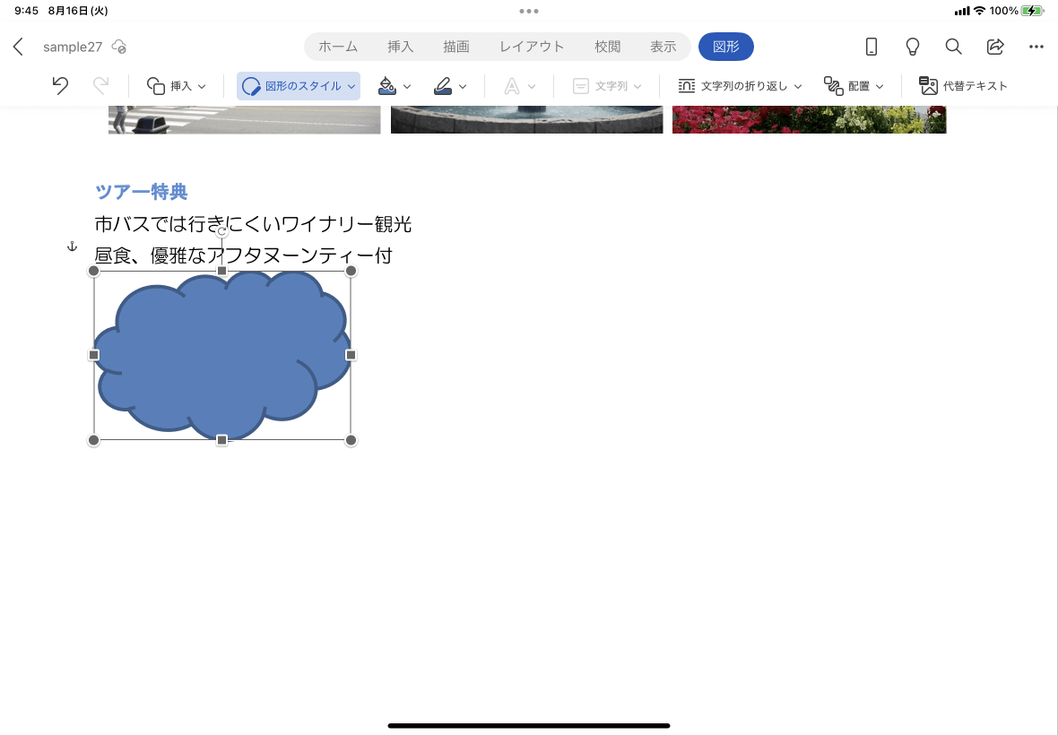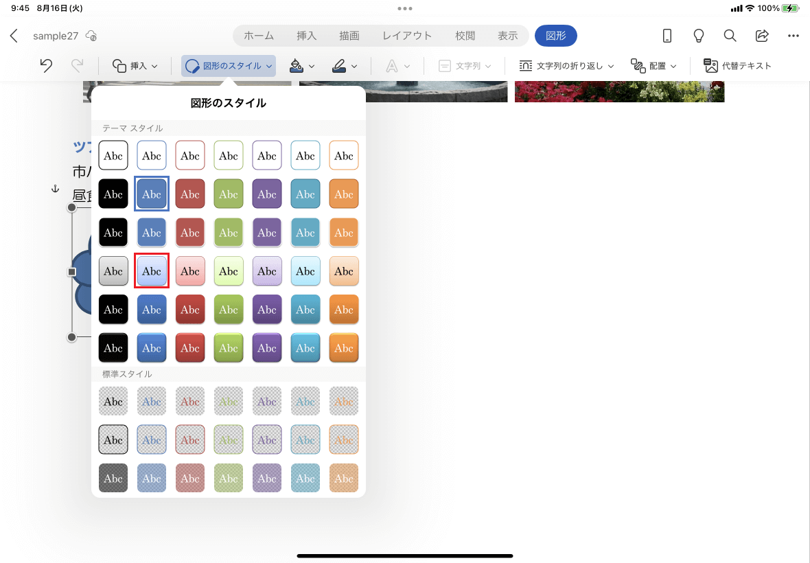 - 図形を選択して[図形]タブを開き、[図形のスタイル]コマンドをタップします。