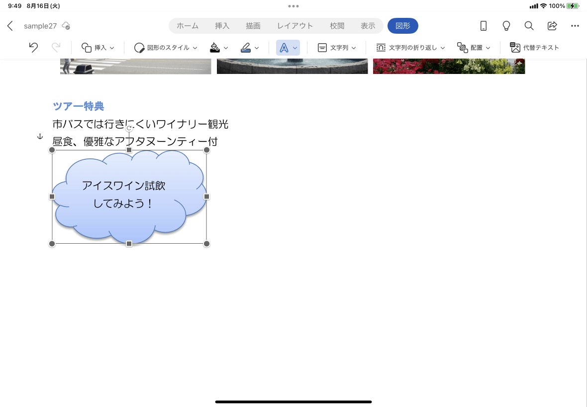 - 図形内の文字すべてに適用するには、図形を選択して[図形]タブを開き、[ワードアートスタイル]をタップします。