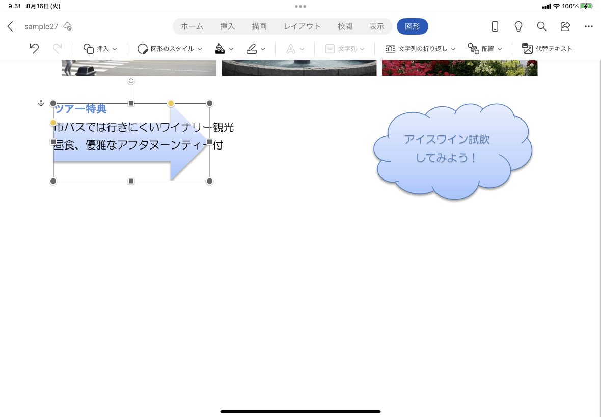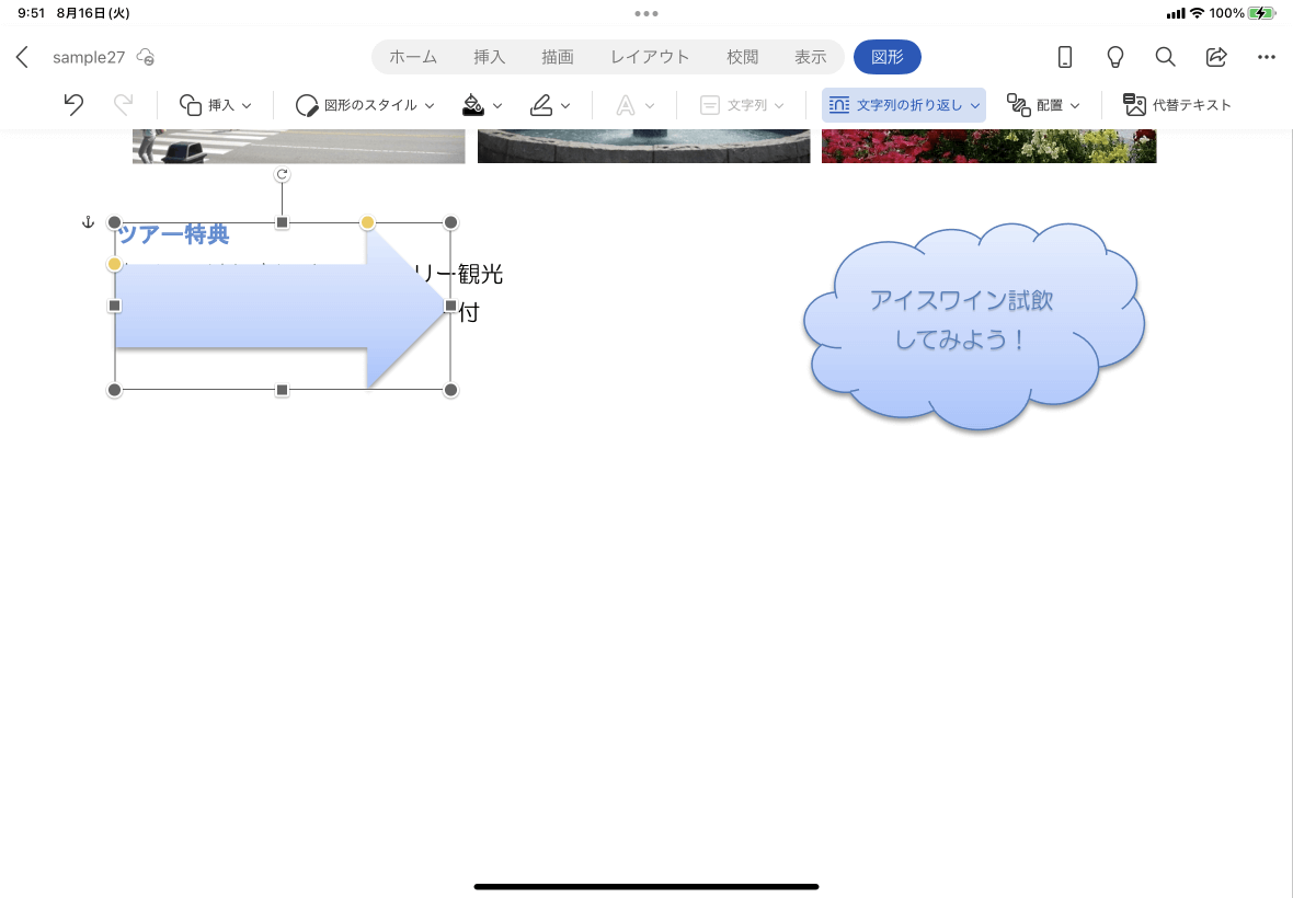 - 図を選択して、[図形]タブを開き、[文字列の折り返し]をタップします。