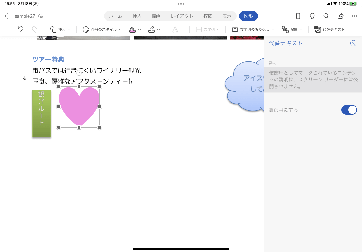 単なる装飾の図形の場合は、[装飾用にする]にスイッチを入れておくとOKです。