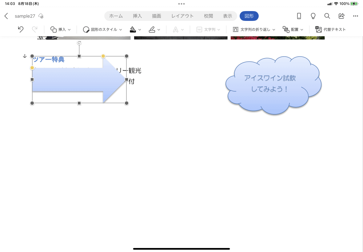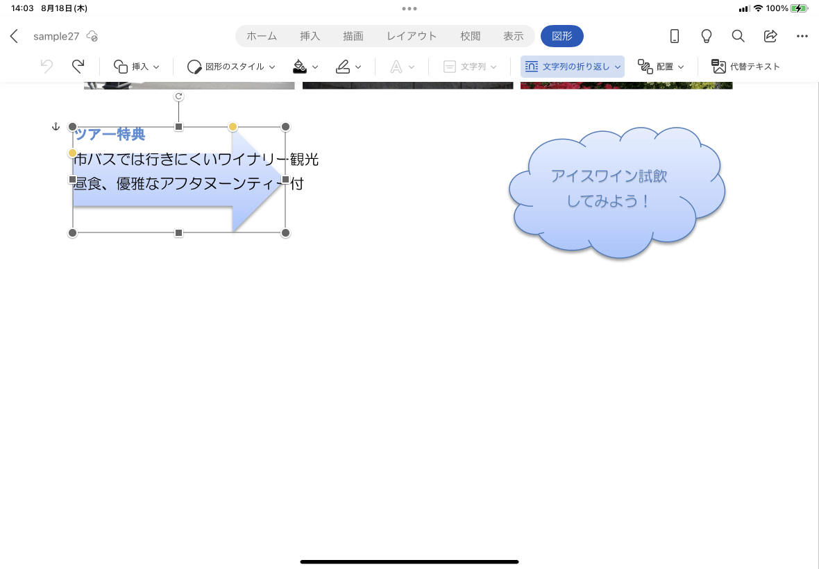 - 図形を選択して、[図形]タブを開き、[文字列の折り返し]をタップします。