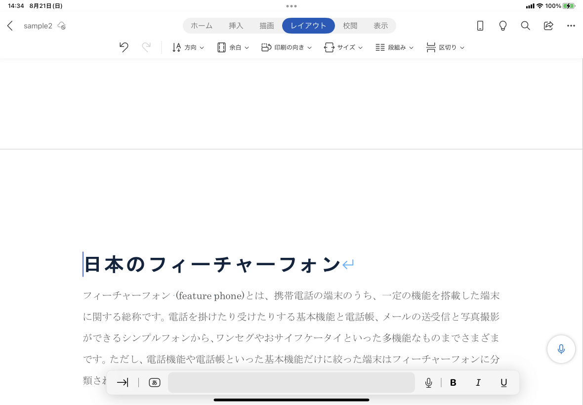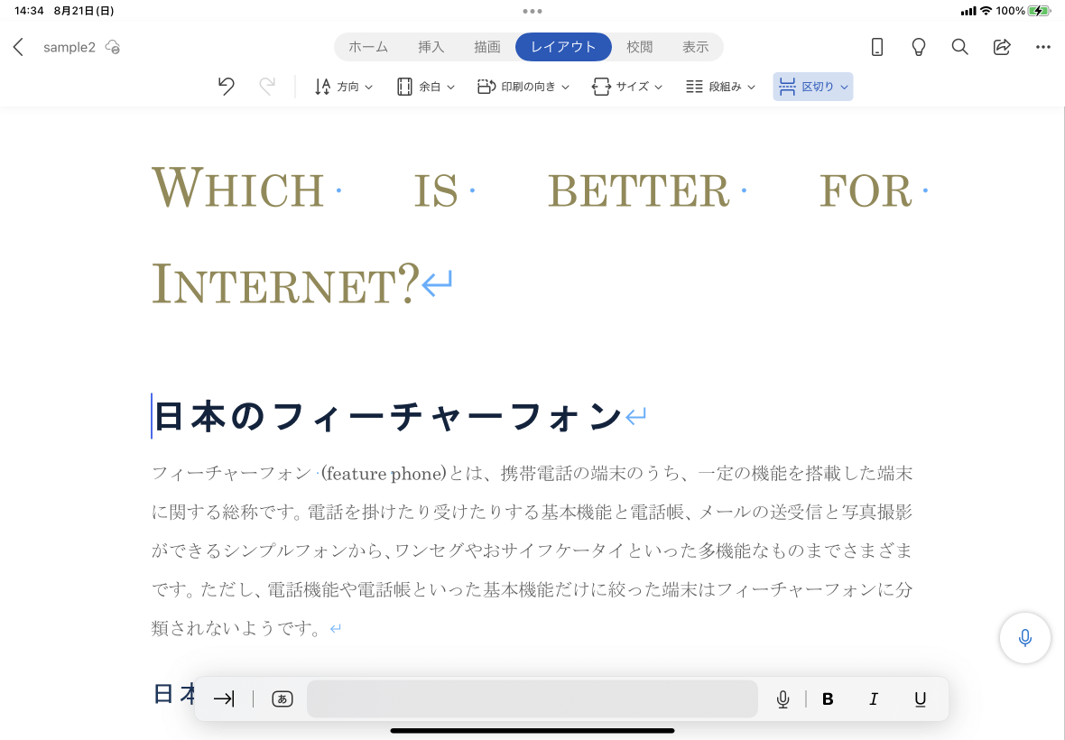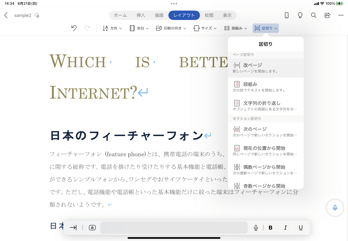 - 改ページを開始したい場所にカーソルを移動して[レイアウト]タブを開き、[区切り]をタップします。