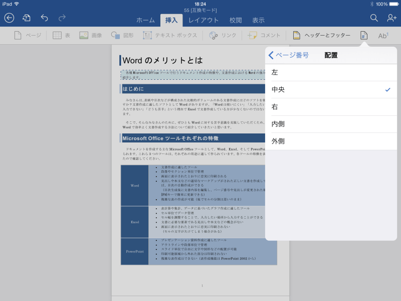 - [中央]を選択すると、ページ番号が中央に配置されました。