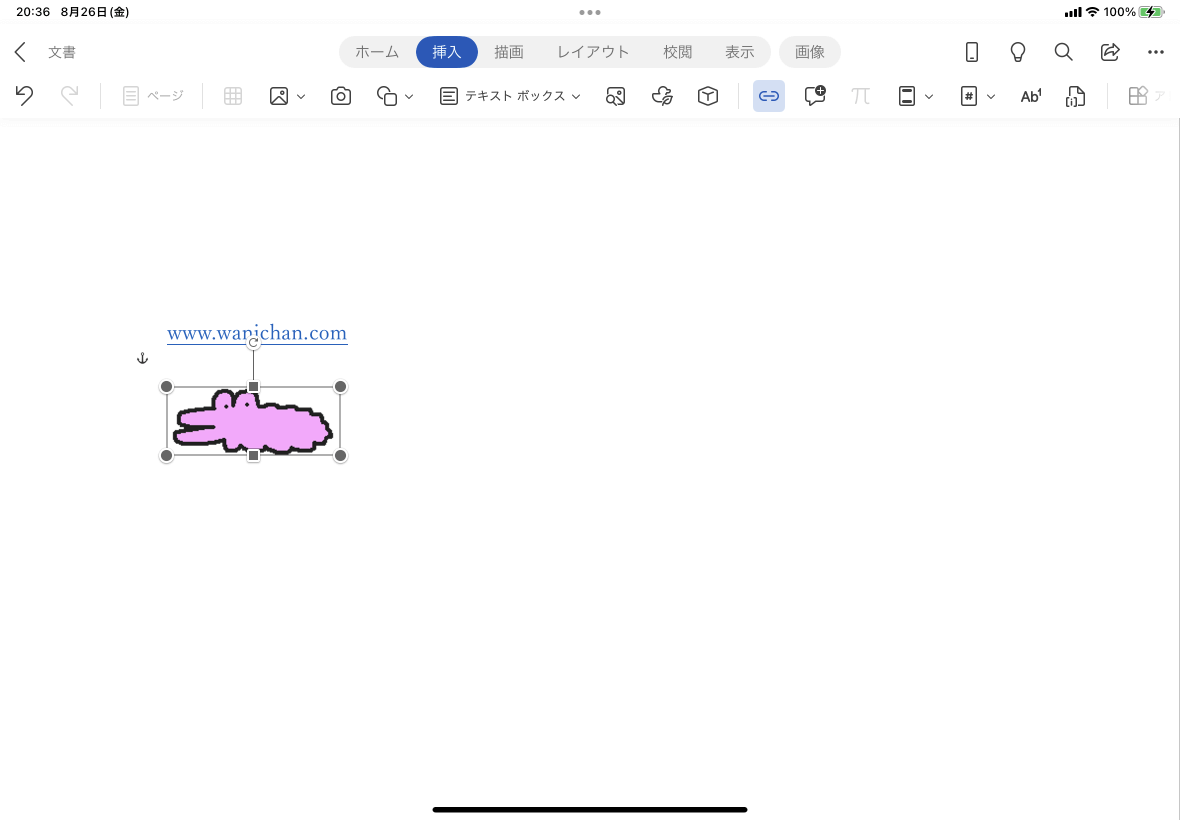 ハイパーリンクを挿入したい画像を選択し、ポップアップメニューから[リンク]を選択するか、[挿入]タブの[リンク]をタップして、アドレスを http:// (もしくは https://) から入力し、[完了]をタップします。