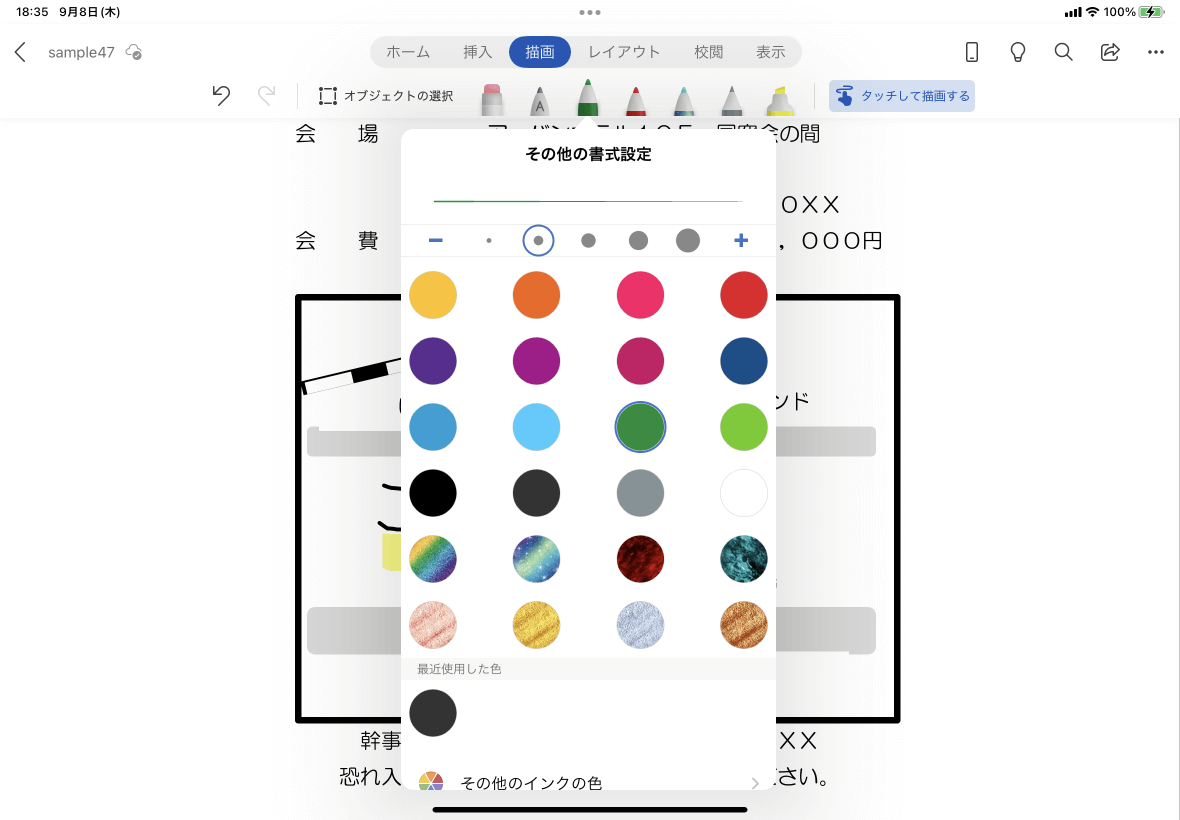 - 色を変更したいペンをタップし、[その他の書式設定]一覧より変更したい色を選択します。