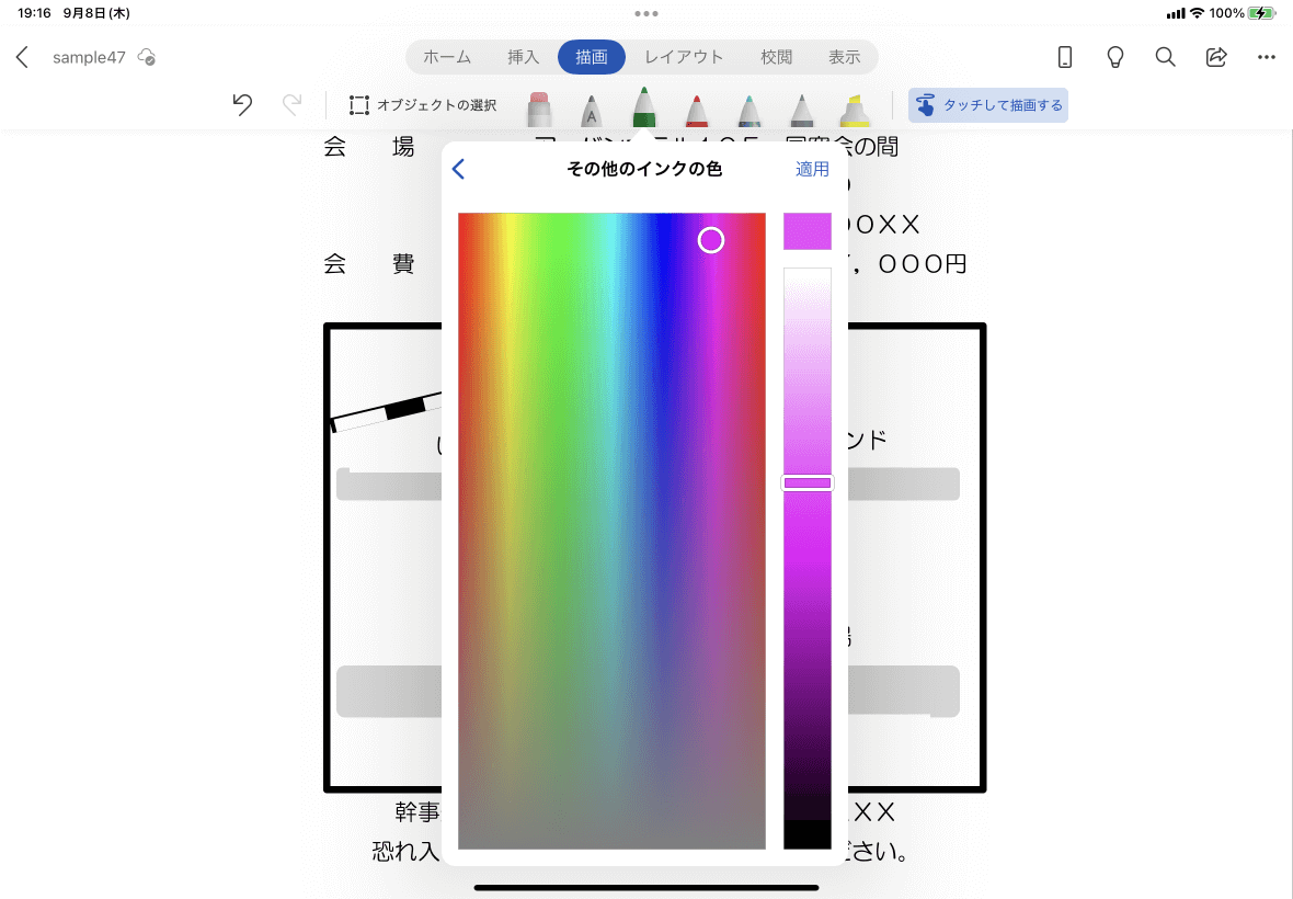 既定の黒からペンの色をフルカラーから自由に変更できます。色を変更したいペンをタップし、[その他の書式設定]一覧より[その他のインクの色]一覧から変更したい色を選択し、[適用]をタップします。