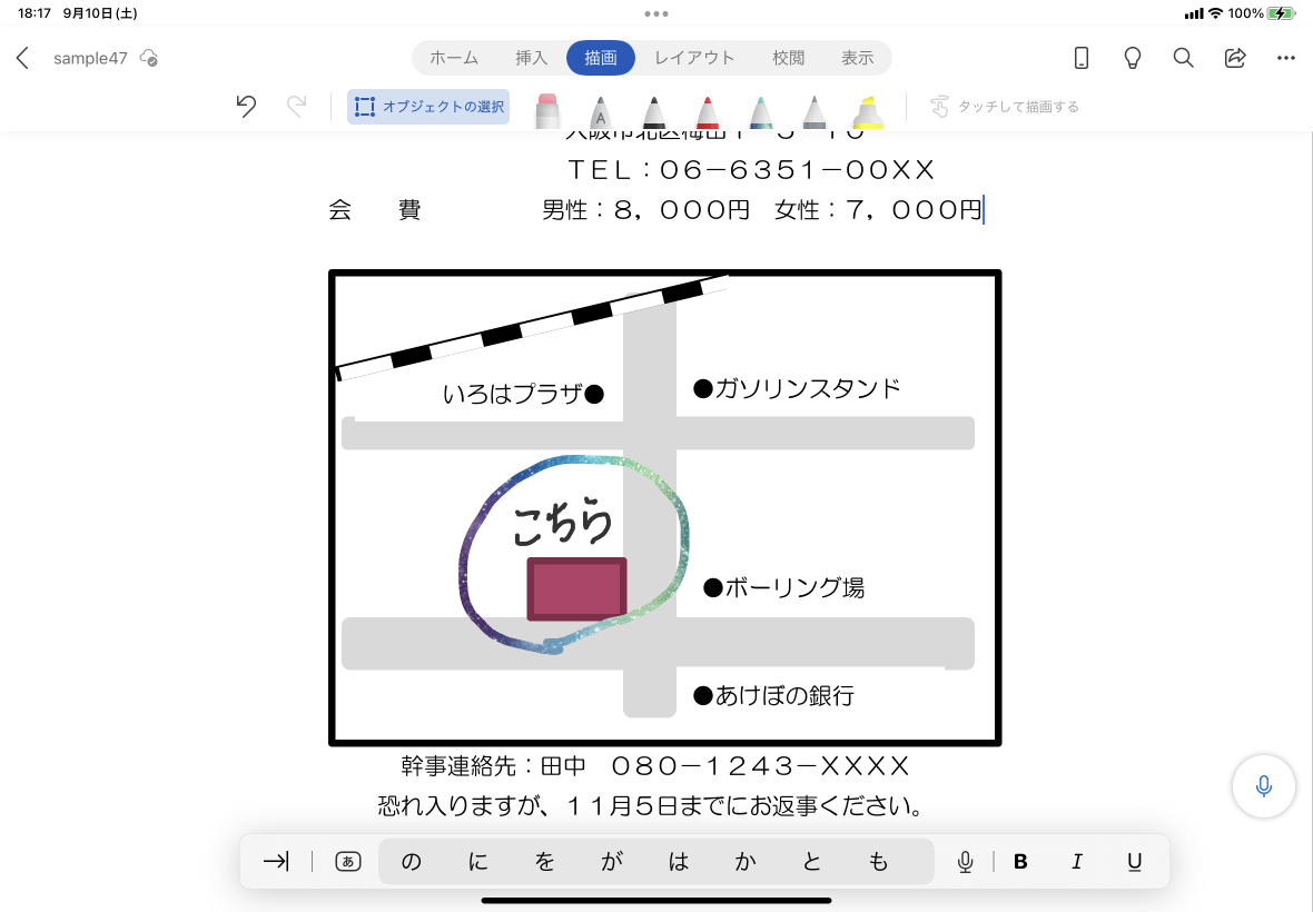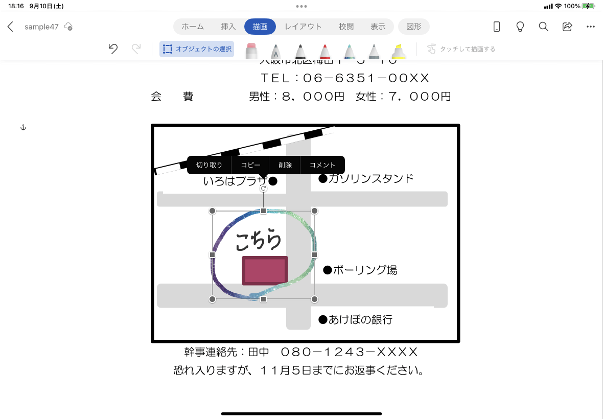描画モードを終了し、通常の編集ができるようにするには、[描画]タブの[オブジェクトの選択]を選択します。すると、描画したものがオブジェクトとして選択できるようになり、キーボード入力ができるようになります。