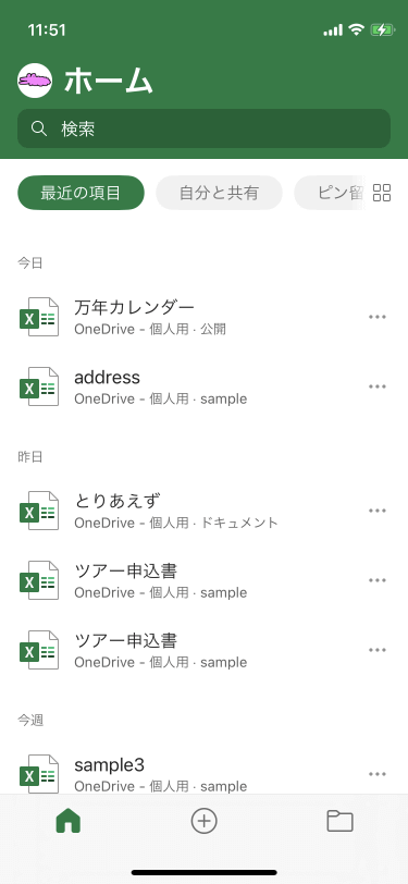 Excel for iPhoneからでもOneDrive上のファイル名を変更できます。対象となるファイルの項目の右側の