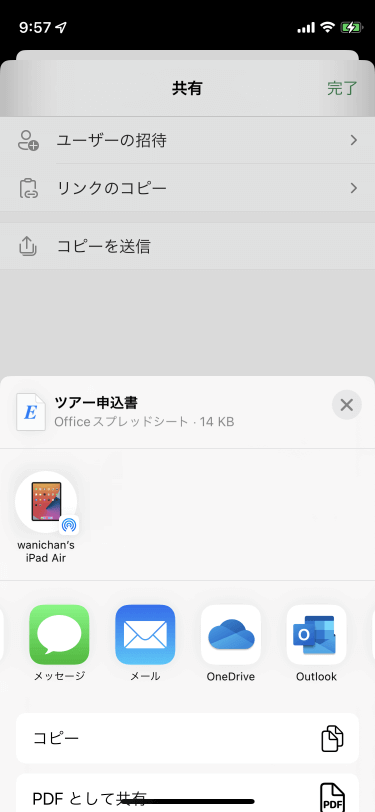 [共有]をタップし、[コピーの送信]から[Outlook]を選択すると、Outlookアプリが起動して、新しいメールのメッセージにそのブックのコピーが添付されます。