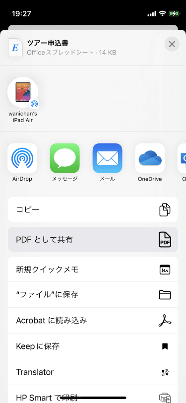 - Excel ブック形式になっているので、[PDFとして共有]をタップします。