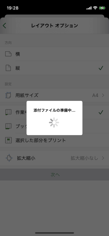 プリントの向き、設定、PDFへ変換対象の範囲を指定します。作業中のシートでA4縦向きのままでいい場合はそのまま[次へ]をタップします。
