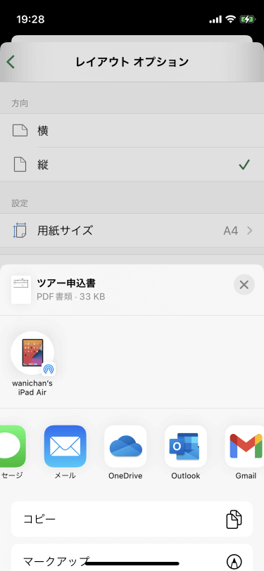 [ファイル]をタップし、[コピーの送信]から[PDFとして共有]を選択すると、PDFにエクスポートする対象を指定する画面が表示されます。適宜設定したうえで[Outlook]を選択することで、Outlookアプリが起動して、新しいメールのメッセージにPDFとして添付されます。