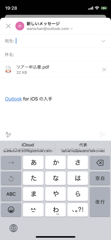 新しいメッセージにPDF形式で添付されたことを確認し、宛先や件名等を編集して、右下の