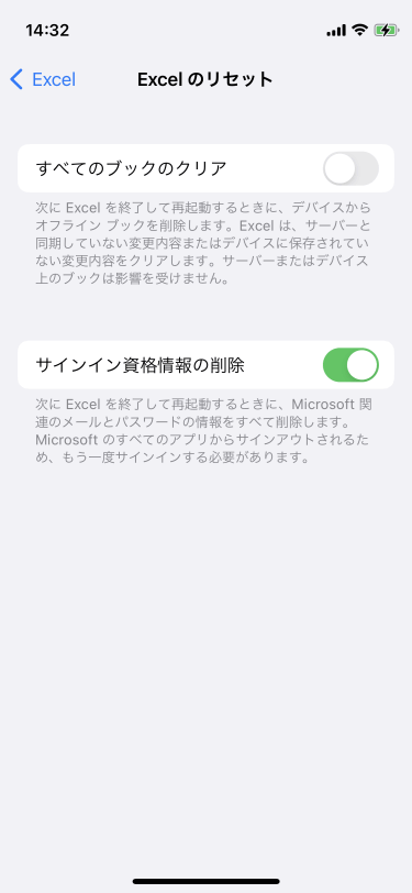 次にExcel for iPhoneを終了して再起動するときに、Microsoft関連のメールとパスワードの情報をすべて削除するには、[設定]から[Excel]をタップして、[Excelのリセット]をタップし、[サインイン資格情報の削除]のスイッチをONにします。すると、Microsoftアカウントからサインアウト状態となるため、次回Excel起動時にサインインする必要があります。