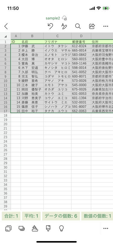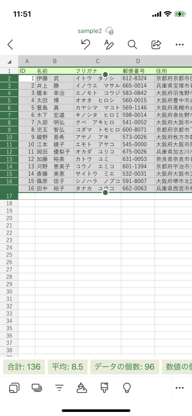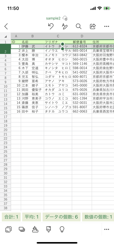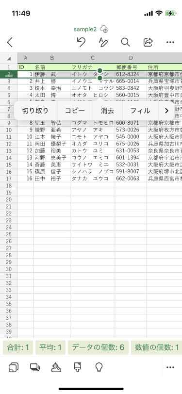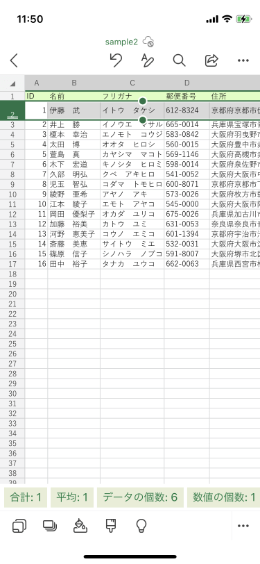 - 行番号をタップして行全体を選択し、行番号の下辺にある下駄ハンドルに触れます。
