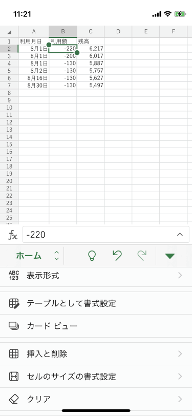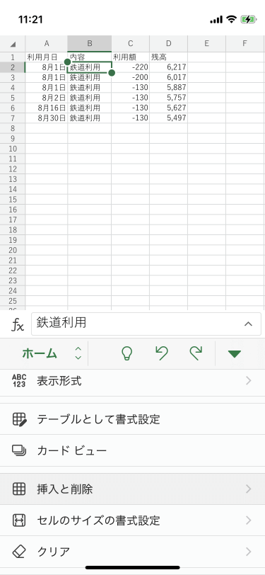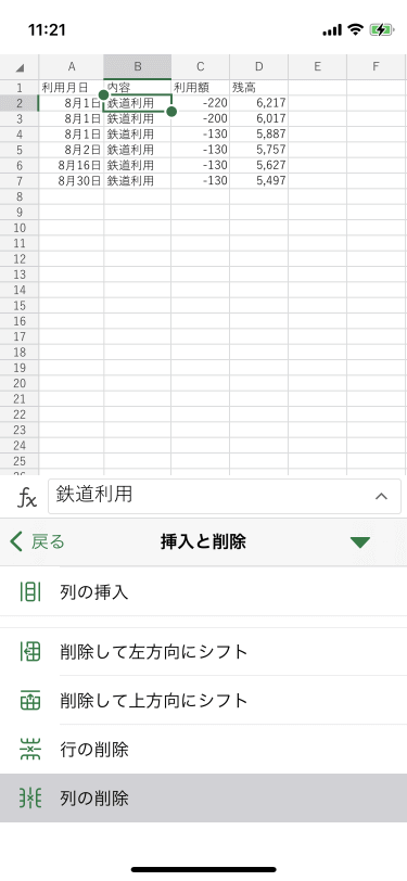 Excel for iPhoneで選択したセルの列全体を削除したい場合は、挿入すべき場所のセルを選択して、画面右上の