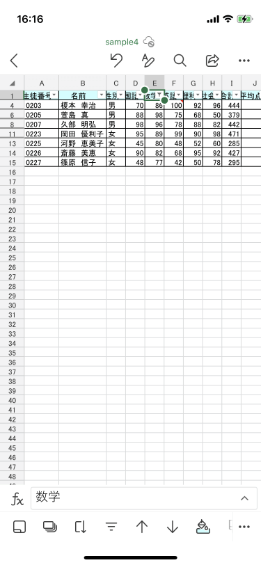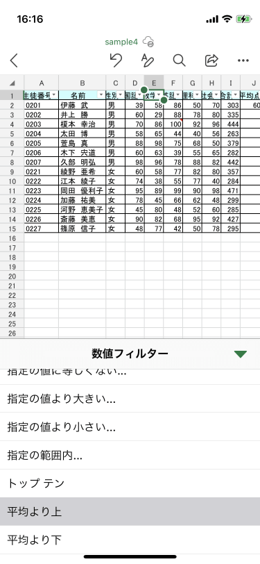 オートフィルターでの平均より上または下の表示機能は、数値と日付データの場合に利用できます。抽出したい列見出しのフィルターボタンをタップするか、下端ツールバーから